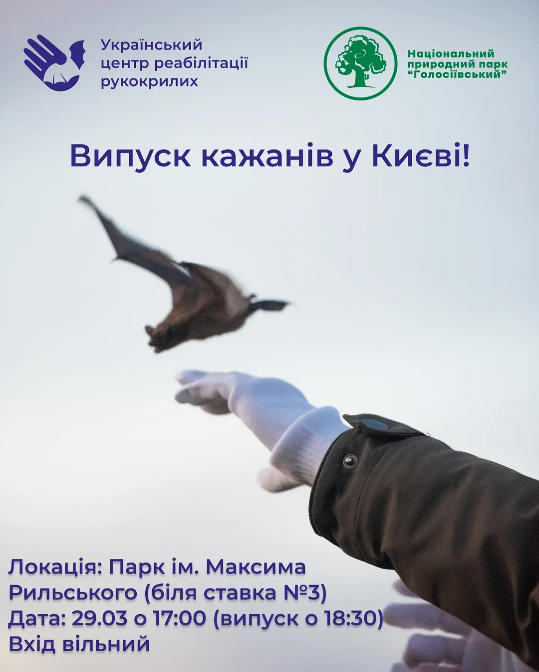 Національний природний парк "Голосіївський" та український центр реабілітації рукокрилих запрошують усіх охочих на урочистий випуск кажанів: повернення в дику природу рукокрилих, врятованих під час зимового сезону.