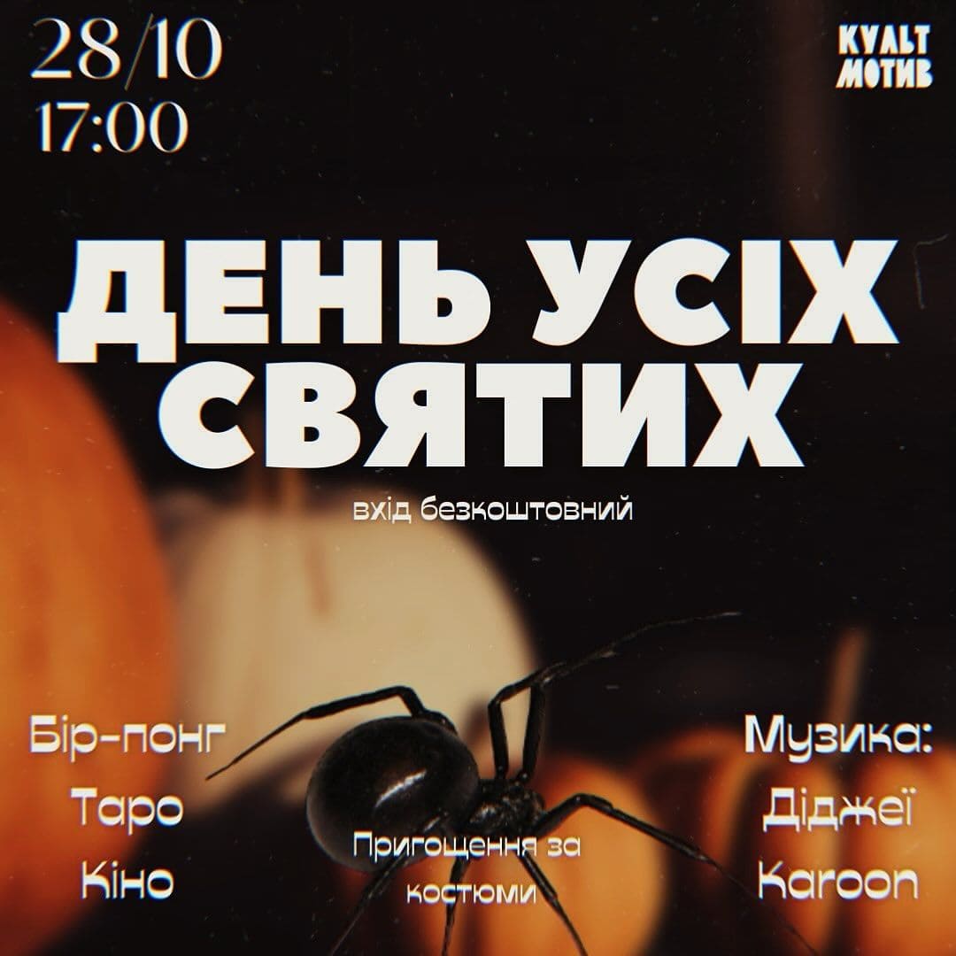 Мистецький простір "Культмотив" організовує "День усіх святих". На гостей чекає: таро, бір-понг із класикою жахів. Хедлайнер вечора жахливо неймовірні KAROON А для усіх, хто завітає у костюмі відьми, вампіра або іншому жахливому образі, чекають гостинці.
