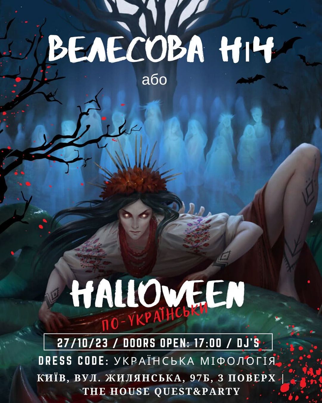 Вечірку влаштовують THE HOUSE QUEST AND PARTY. На гостей чекають цікаві обряди, гадання. Також цього вечора будуть DJ's, феєричні шоу та унікальний декор, що створить незабутню атмосферу. А пригощатиме легендарний бар з Одеси TWISTED. Обов'язковий dress code: українська міфологія (Потерчата, Перелесник, Чугайстер, Мавки, Відьмак, Кобиляча голова, Вихор, Вій, Вовкулак тощо). Придбати аксесуари та зробити грим можна на вході. У тебе буде відмінна нагода зробити круто-страшні фотозони для ваших фото та рілсів.