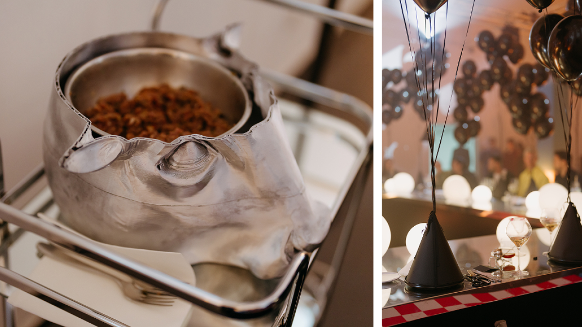 Простір оформили виразно, але без зайвих жестів: глибокі тіні, світлові акценти, чорно-золоті деталі, впізнавані принти Seletti та звана італійська вечеря. Декор зали та сервірування столу працювали як єдина композиція, що задає тон локації — немов сцена, на якій дизайн і гастрономія грають власну зіркову виставу.