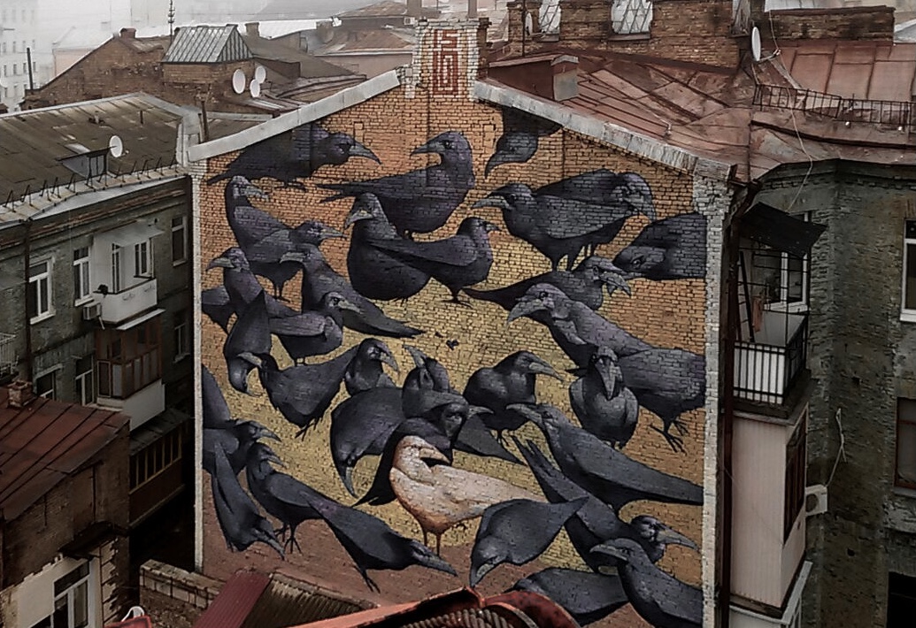 Упродовж створення муралу за мною спостерігали круки, а я — за ними. Насправді ці птахи дуже розумні та вправно імітують різні звуки. Сигналізацію машини вони відтворювали так правдоподібно, що я не одразу зрозумів, що то круки!