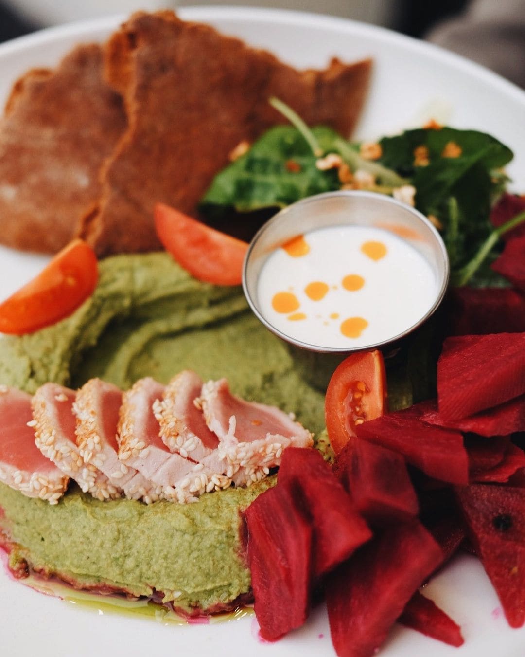 Чудове місце не лише для поціновувачів інстаграмних локацій, але й смачної кухні Близького Сходу. В меню: хумус, хумус з овочами та піти зі свіжим орегано й шакшука.