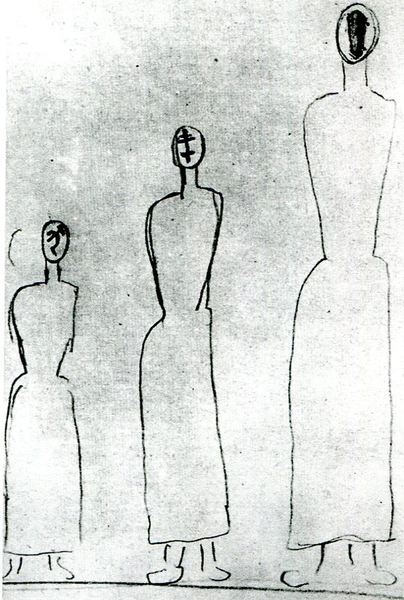Також Малевич чи не єдиним з митців того часу увічнив у своїй творчості трагедію Голодомору на ескізі, що відсилає до відомої народної пісні "Де серп і молот, там смерть і голод".