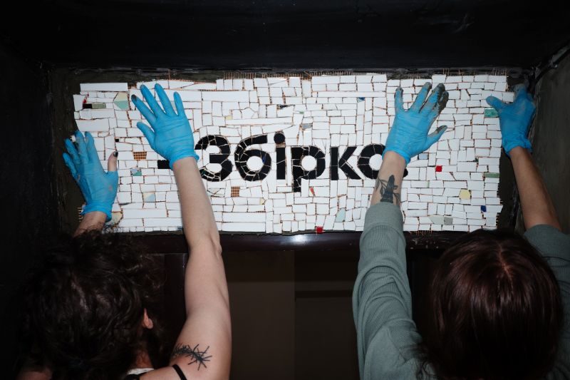 У результаті з'явилася чудова мозаїка: напис "Збірка", поруч — відкрита чиста сторінка книги, а навпроти неї — дзеркало. Воно відображає ці сторінки, і коли ми заходимо всередину, здається, ніби потрапляємо у світ книги.