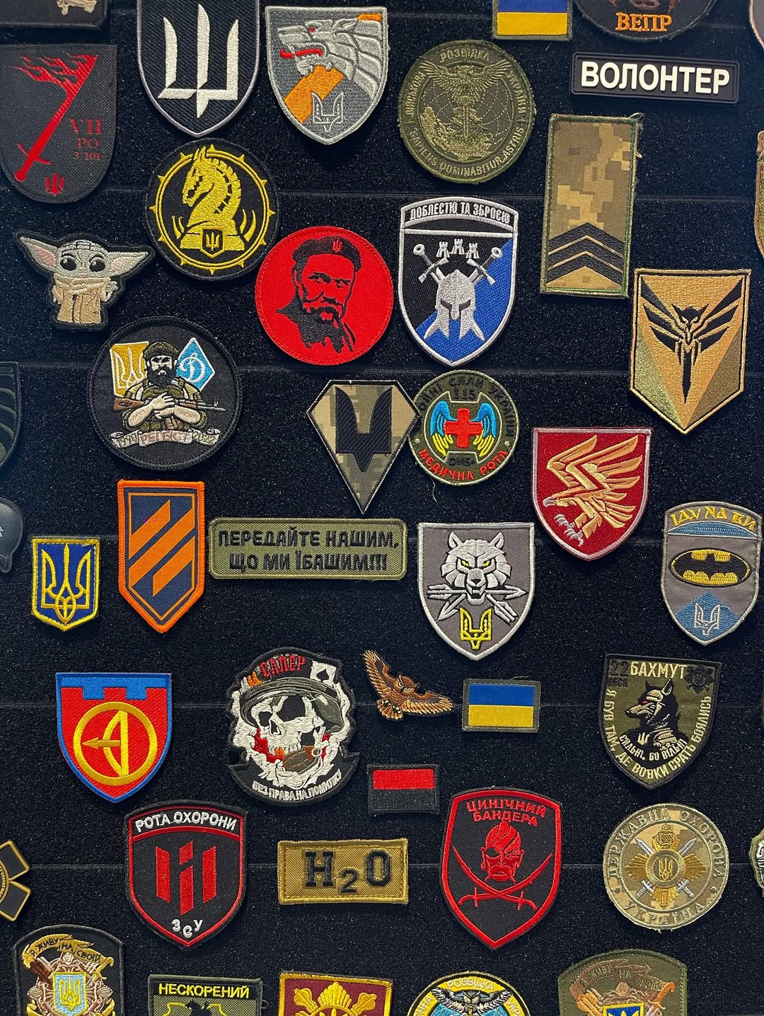 Так, у нас дуже великий стенд — майже на всю стіну. Коли ми відкривали кав'ярню, там була лише метрова стрічка і три шеврони. Зараз стенд майже як я заввишки й повністю заповнений. Наразі тут близько 100 шевронів — це пам'ять про наших гостей та друзів, загиблих захисників. Завдяки їм ми можемо продовжувати працювати, і взагалі завдяки їм ми тут.