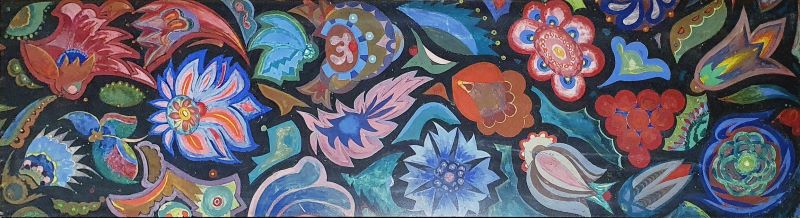 В аплікаціях, як і у своїх настінних розписах, Кузнецов часто використовує три кольори — чорний, білий і червоний.