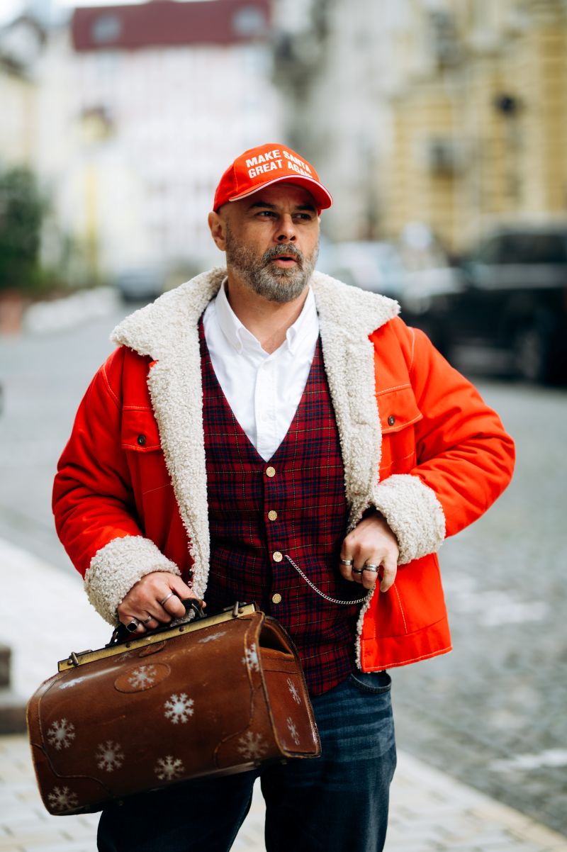 У зовнішності Санта Клауса поєднали його класичний біло-червоний костюм та сучасні американські мотиви. А ще додали гумору: наприклад, "сучасний" Санта одягнений у джинсову куртку з Берліна та кепку з написом Make Santa Great Again.