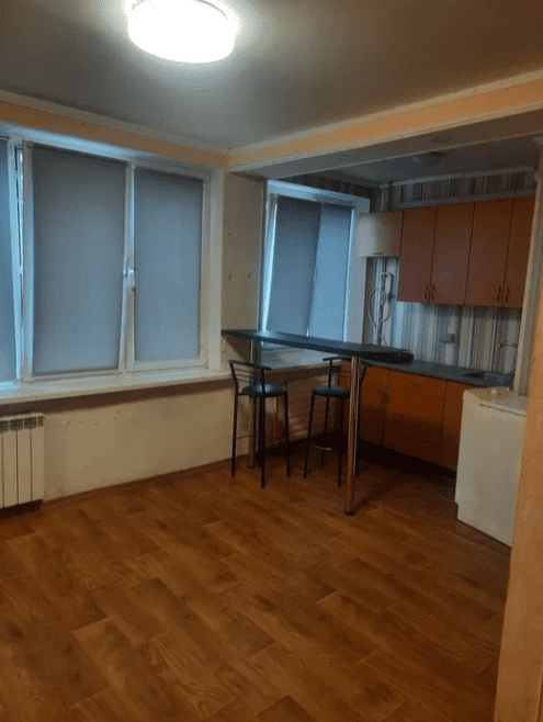 Для оренди доступна також однушка на бульварі Жуля Верна, 14 (Ромена Роллана) у Святошинському районі. Як наголошує власник житла — ця квартира за 4 500 грн здається вперше. У кімнаті є стіл, диван, що пережив не одне покоління, два стільці, шафа, бабусин сервант і затоптаний килим, який, ймовірно, живе тут ще за часів Брежнєва. На кухні площею 4 м² є газова плита й холодильник. А вікна від сорому прикривають старі засмальцьовані ролети. У санвузлі є натяк на душову і туалет, а також тут умістили стару раковину. Щоправда, у квартирі немає пралки. На балкон орендарям також не варто розраховувати. Зате поруч станція метро "Святошин" — усього 15 хвилин пішим ходом. Поруч, як йдеться в оголошені, зупинка транспорту й супермаркет.