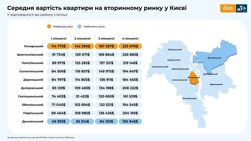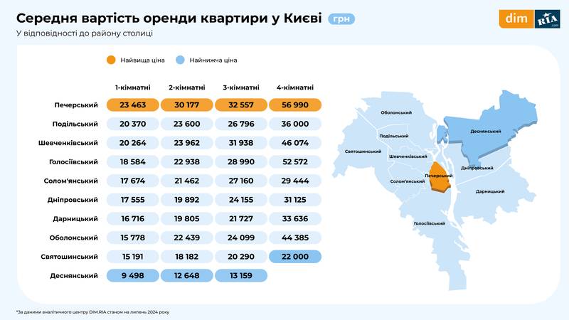 А винайняти трикімнатну оселю коштуватиме у середньому 25 810 грн (на 1% дорожче, ніж у червні та на 30% дорожче, ніж у 2023 році). Традиційно, найдешевша оренда квартир у Деснянському районі — 13 159. А найдорожче вона коштує у Печерському — 32 557 грн.