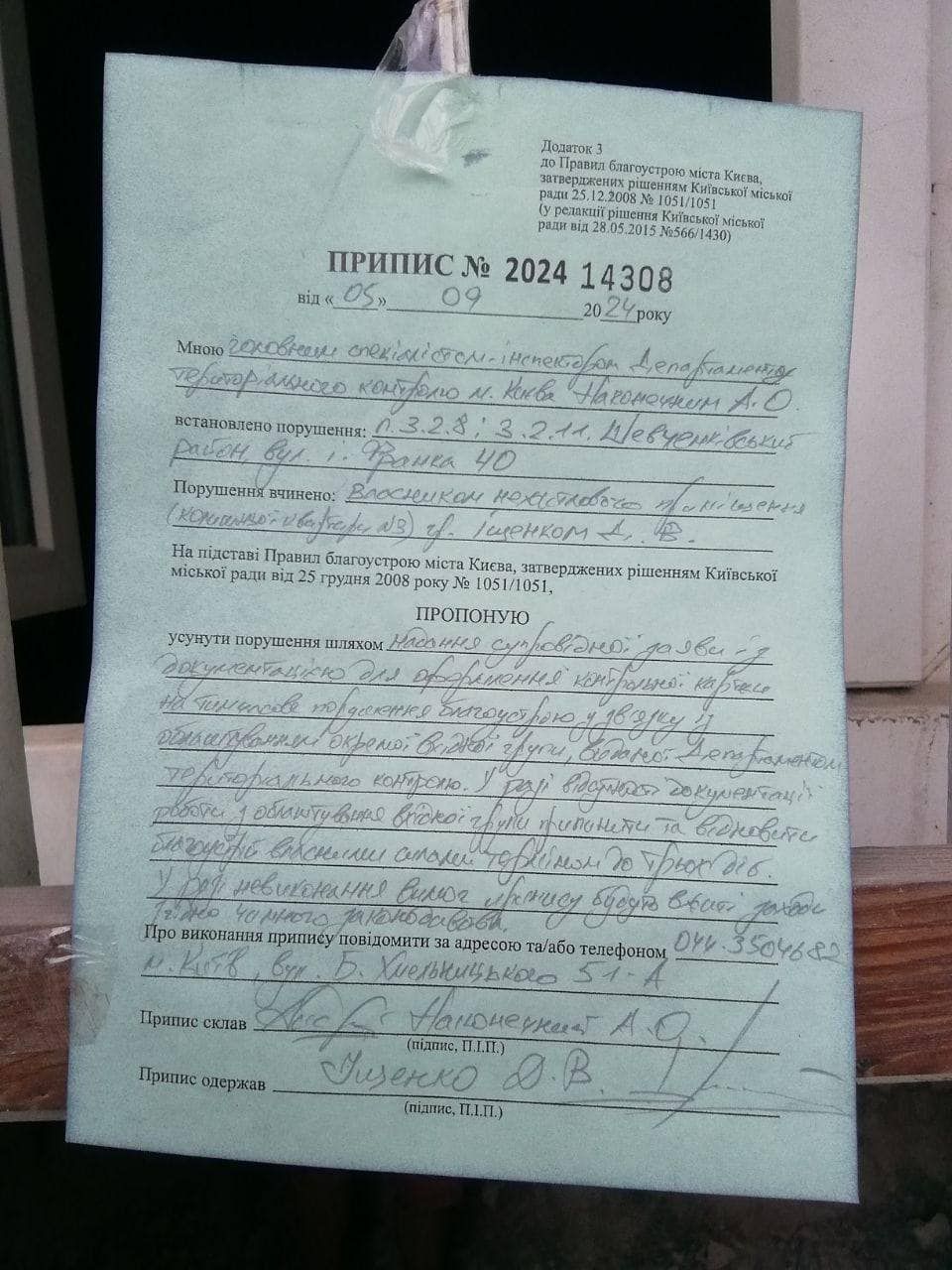 Перов додав, що погоджень щодо облаштування вхідної групи та фасадних робіт на історичній пам'ятці власник не мав. Тому Департамент територіального контролю видав припис і склав адміністративний протокол.
