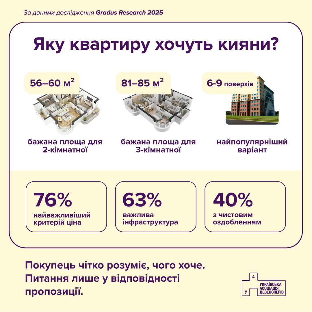 Більшість респондентів віддають перевагу дво- або трикімнатним квартирам. Найбільш бажана площа для двокімнатних помешкань — 56–60 кв. м, для трикімнатних — 81–85 кв. м.