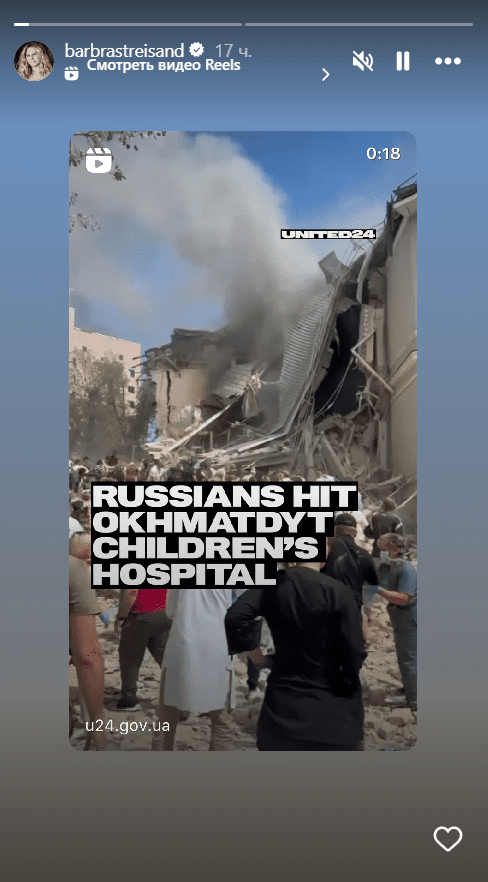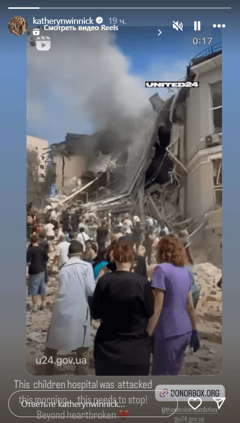 Інформацією про ракетну атаку та посиланням на донати зі своєю авдиторією поділилися й інші амбасадори UNITED24: Міша Колінз, Марк Стронг, Барбра Стрейзанд і Кетрін Винник.