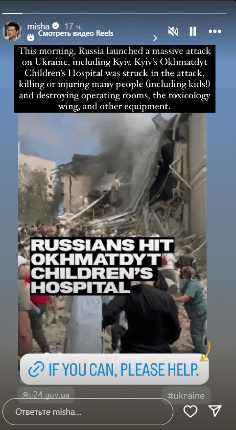 Стиліст та дизайнер Френк Вільде, який регулярно нагадує про російську агресію проти України підтримав нас серією селфі в ліфті із кадрами жахливих наслідків удару по лікарні "Охматдит".