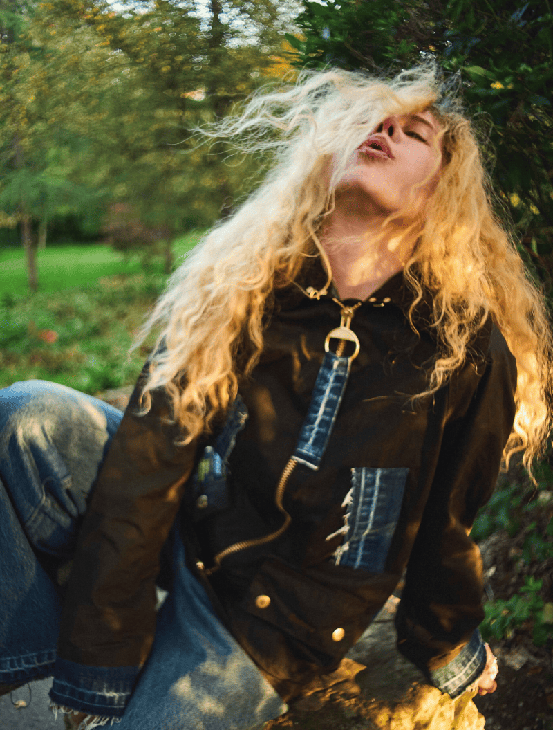 Перша куртка Barbour ALLERSTON WAXED JACKET, виконана з фірмового вощеного бавовняного полотна бренду, а доповнили її денім-печворком від KSENIASCHNAIDER. У ній зберегли класичну підкладку з принтом "тартар", прикрасивши кастомними кобрендинговими бирками, фурнітурою та металевими елементами.