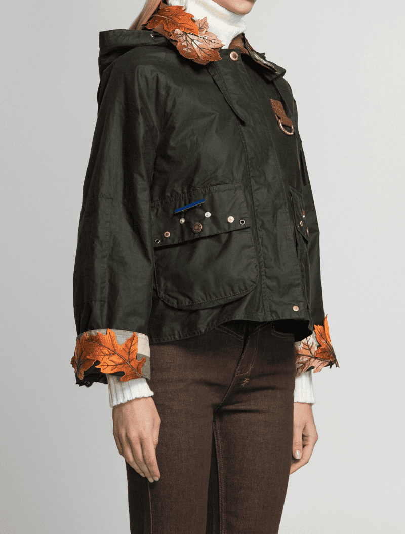 Другу модель Barbour ERMA WAXED JACKET переосмислили "через іронічний дизайн": класичний силует куртки доповнений "листками" — декоративними нашивками. Фірмове вощене полотно кастомізували окремими елементами від KSENIASCHNAIDER: металевими деталями, бирками та фурнітурою.