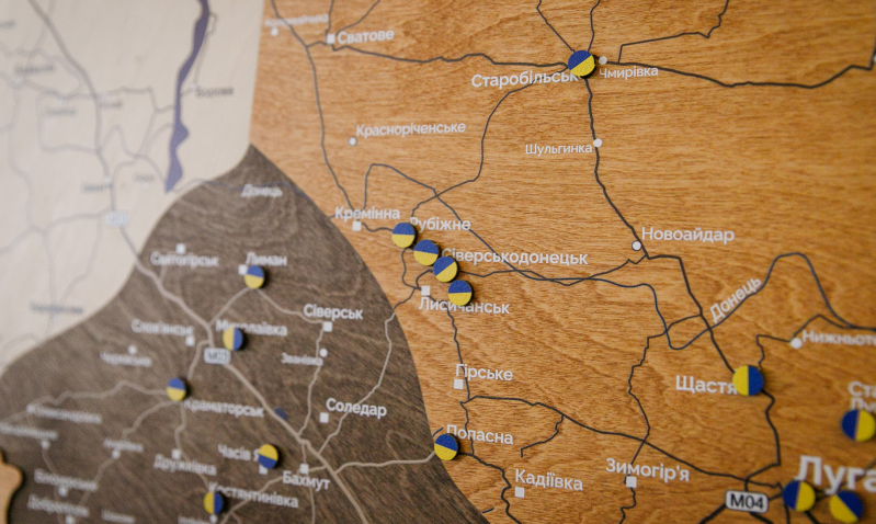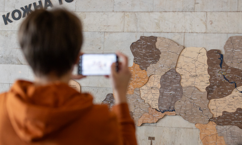 Поруч із мапою є синьо-жовті наліпки, які можна наклеїти. Залишити свою позначку можна до 30 березня 2026 року.