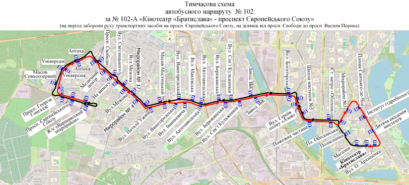 - автобус № 102-А — від кінотеатру "Братислава" до просп. Європейського Союзу за власним маршрутом, далі просп. Свободи — просп. Георгія Гонгадзе — просп. Європейського Союзу (до просп. Василя Порика).