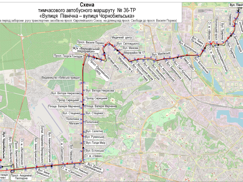 Так, у столиці до 1 грудня продовжили дію тимчасових автобусних маршрутів №36-ТР, №102-А через тимчасове закриття руху на просп. Європейського Союзу — на ділянці від просп. Василя Порика до просп. Свободи: