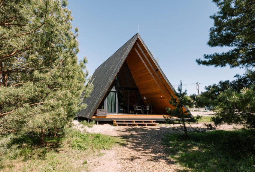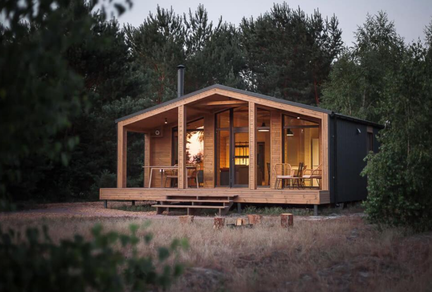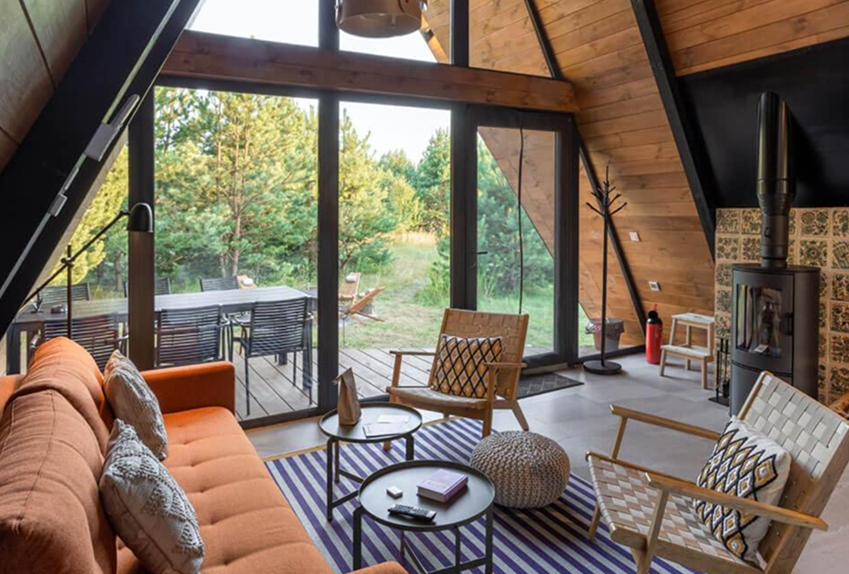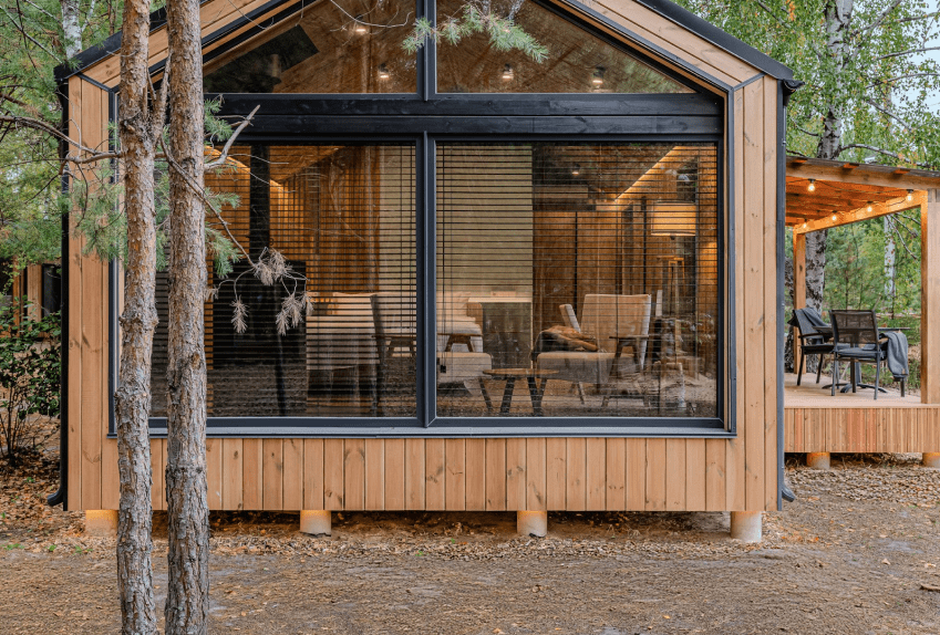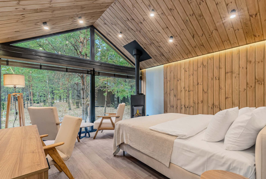 Гостям пропонують затишні будиночки для двох посеред соснового лісу, в яких є зручна тераса, камін та навіть власна лазня або чан.
