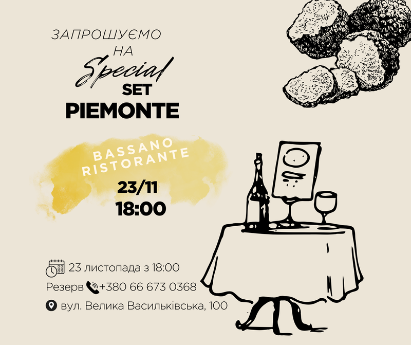 Ресторан італійської кухні Bassano Ristorante проведе сет-вечерю "П'ємонт", яка відбудеться цієї суботи, 23 листопада. Початок вечері — о 18:00, а з 19:00 у закладі гратиме жива італійська музика.