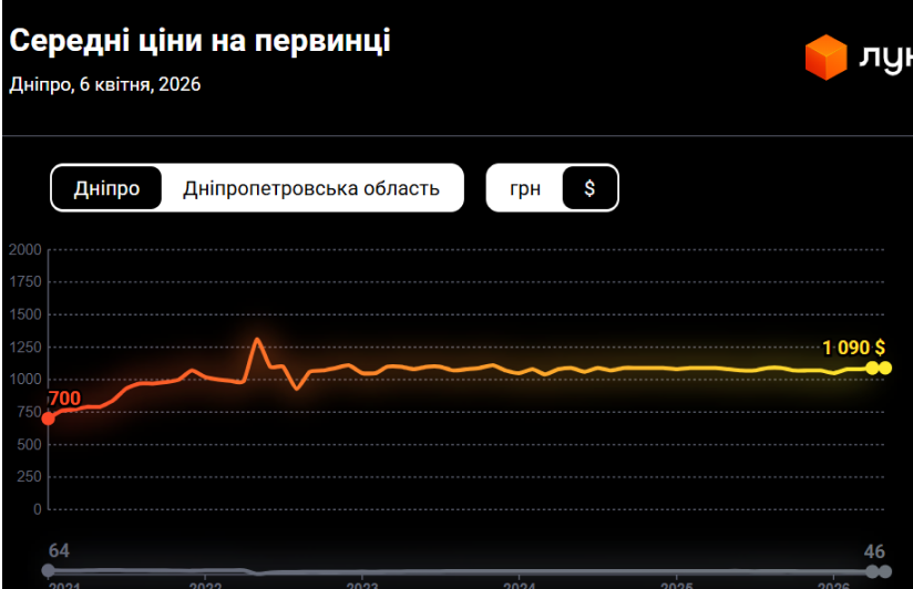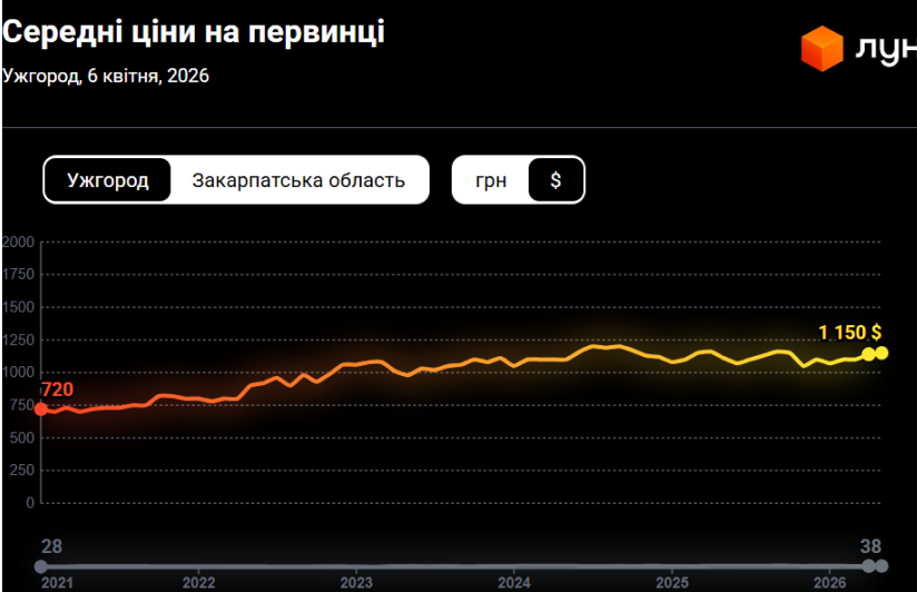 В Ужгороді станом на зараз за один квадратний метр в новобудові доведеться заплатити 1150 доларів, а у Дніпрі — 1090 доларів.