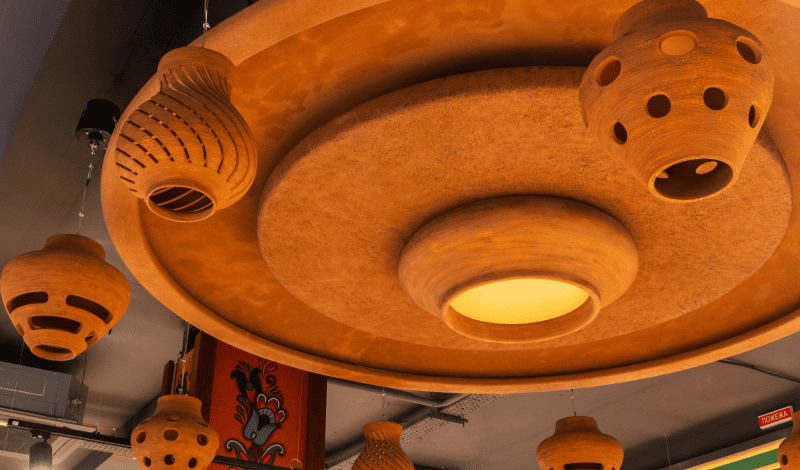 А над відділом садовини та городини встановили гончарне коло, що обертається, та глечики з підсвіткою навколо нього.