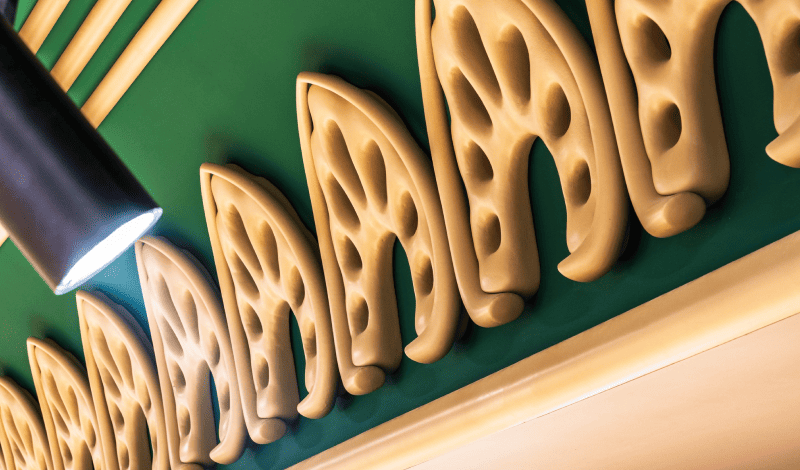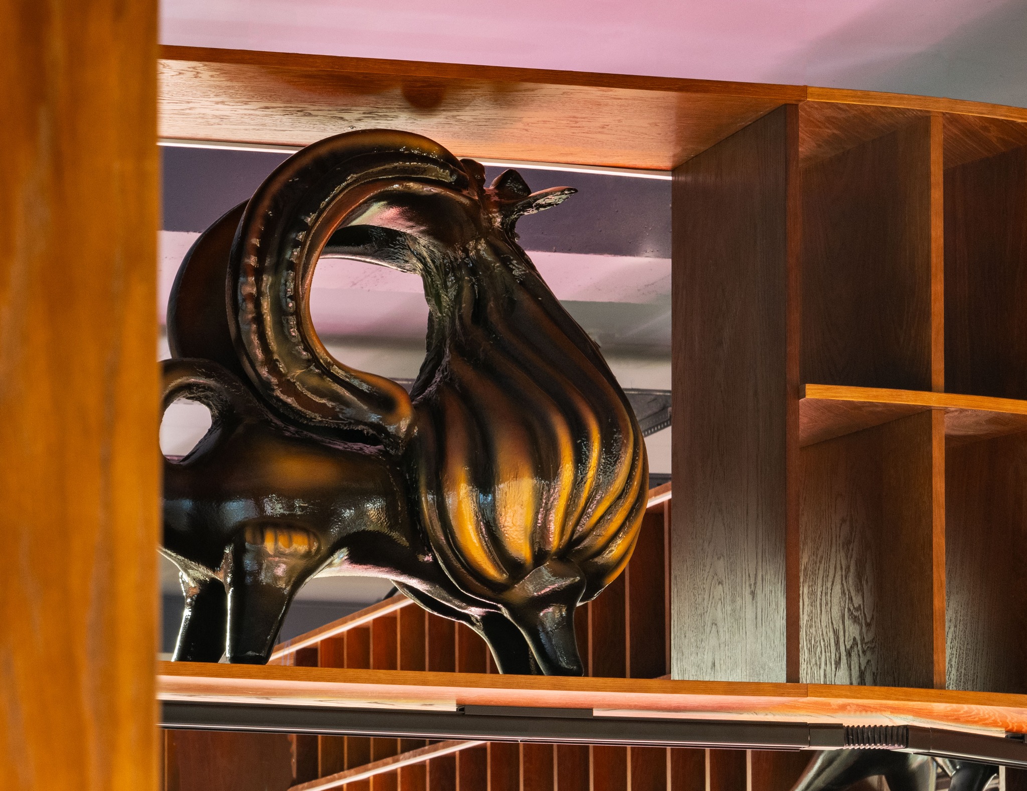 У кожному відділі та вітрині дизайнери поєднали історію із сьогоденням. А біля входу встановили силуети півників та колони-глечики, які розписували вручну. Також в інтер'єрі — півники та химерні тварини, типові для кераміки.