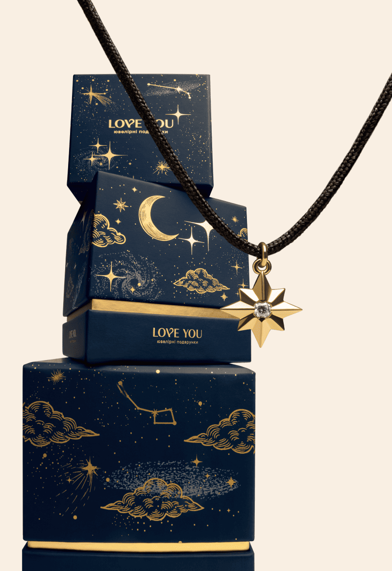 Головним елементом у дизайні прикрас є восьмипроменева зоря, яка набуває сучасної виразності від LOVE YOU. Її промені мають чітку геометрію та легкий об'єм, а делікатно інкрустовані фіаніти підкреслюють форму легким мерехтінням — неначе світло різдвяної зорі.