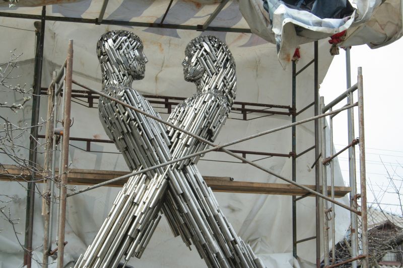 Вимушені реагувати на поради кураторів, ми так і зробили, але ті "сутності", відверто кажучи, візуально мали вигляд двох чоловічих постатей. Жителям мікрорайону такий варіант категорично не сподобався, і люди попросили повернути варіант із зображенням жінки та чоловіка. Тому на вимогу громадськості ми все переробили й повернулися до первинного авторського задуму, де фігура жінки струнка і тендітна, а фігура чоловіка — міцна та мужня, і в цьому симбіозі народжуються гармонія й нове життя. А загалом про створення та встановлення цієї скульптури окремий роман можна писати — стільки там було складнощів! Ми з братом тільки набували досвіду та формували команду професіоналів. Але в підсумку вона вийшла дуже вдалою, на мій погляд.
