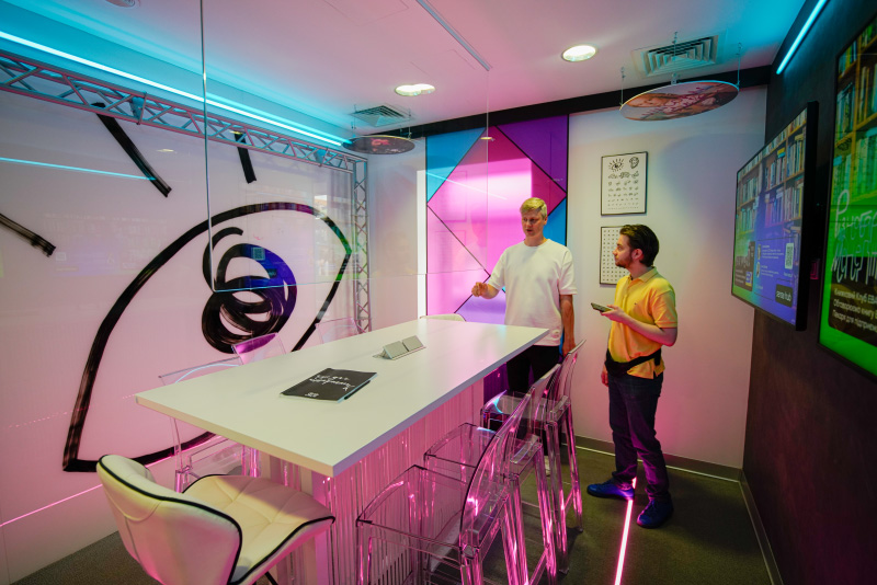 Друга кімната — "Зорова". Обабіч розташовані місця для перемовин, а посередині — скляна поверхня, що ефективно замінює маркерну дошку. Можна робити позначки чи то пак ескізи, а візаві напроти їх одразу побачить. П'ятницями тут іноді проводять ігрові дні: з полудня можна пограти на консолі.