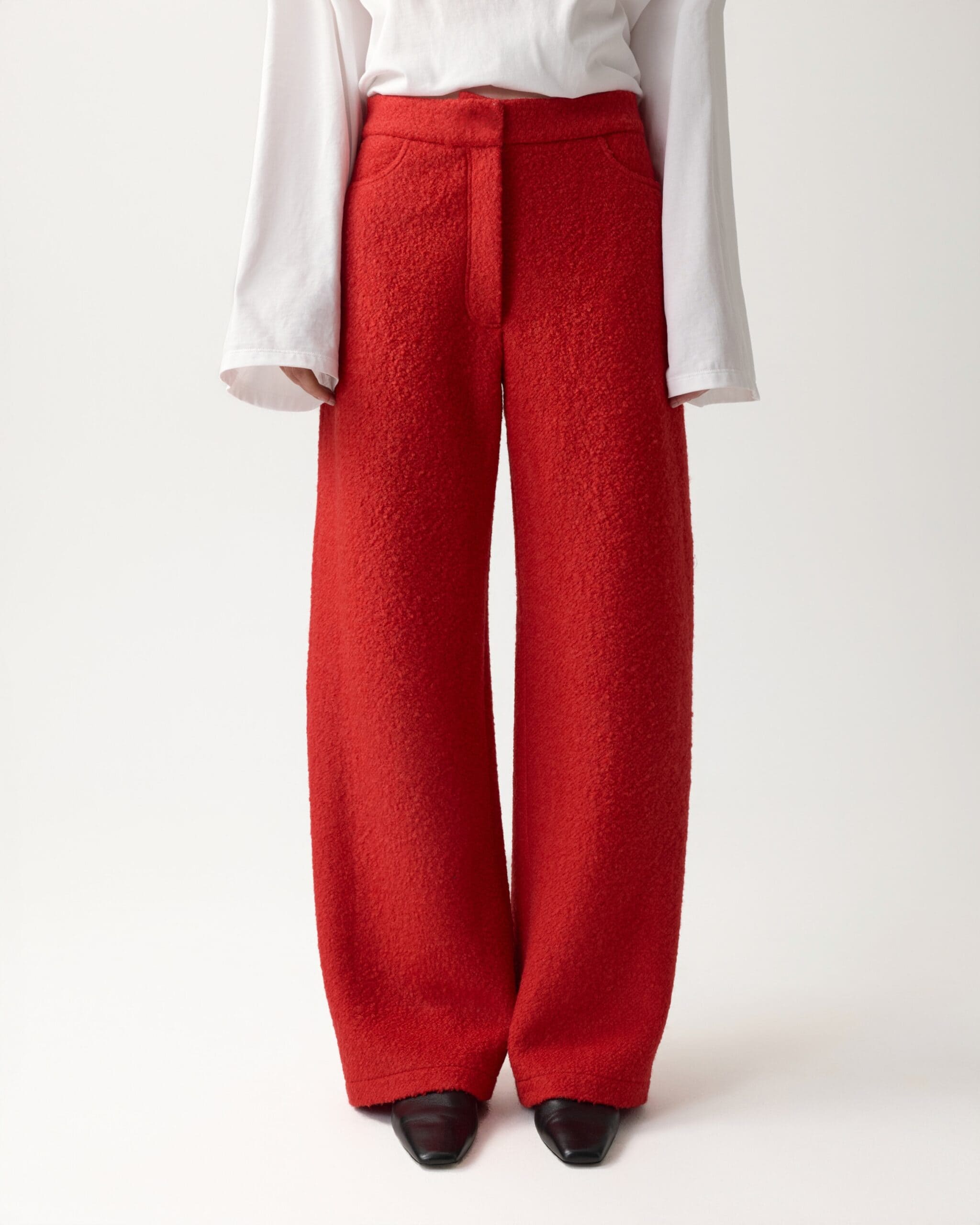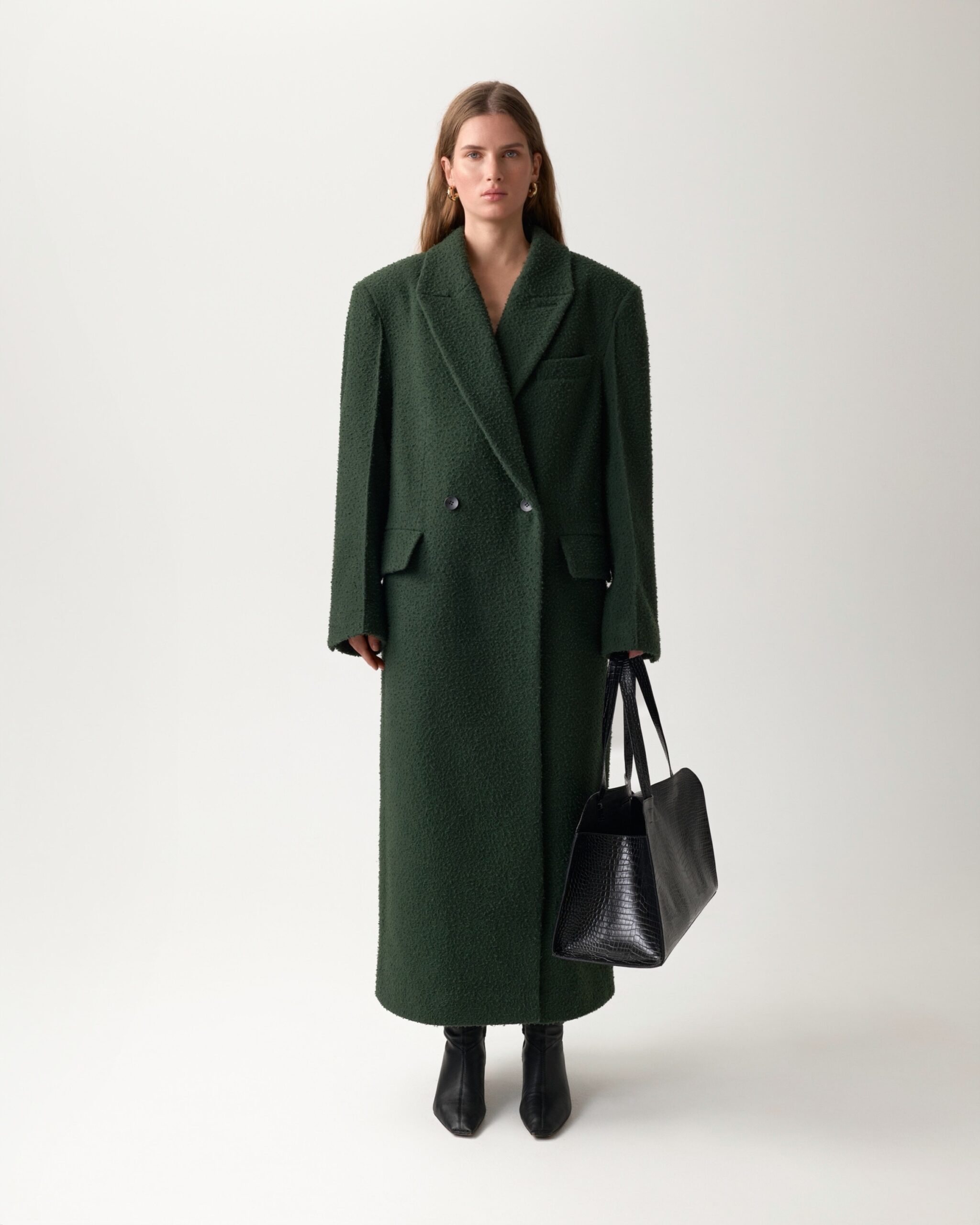 Головний акцент дропу Midwinter Edit від KATIMO — італійська вовна Casentino з багатовіковою історією, відома своєю довговічністю та водовідштовхувальними властивостями. Саме з неї бренд виготовив архітектурні пальта в зеленому й червоному кольорах.