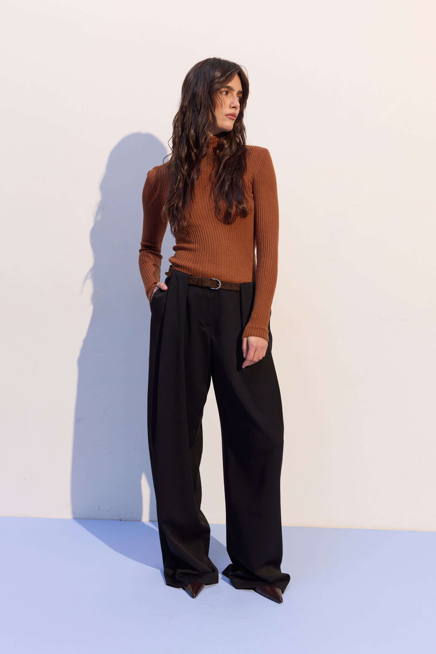 Ще Late Checkout зацікавить тих, хто шукає штани в більш класичному стилі. У колекції наявні моделі прямого крою, у смужку та чорний варіант із декоративними складками.