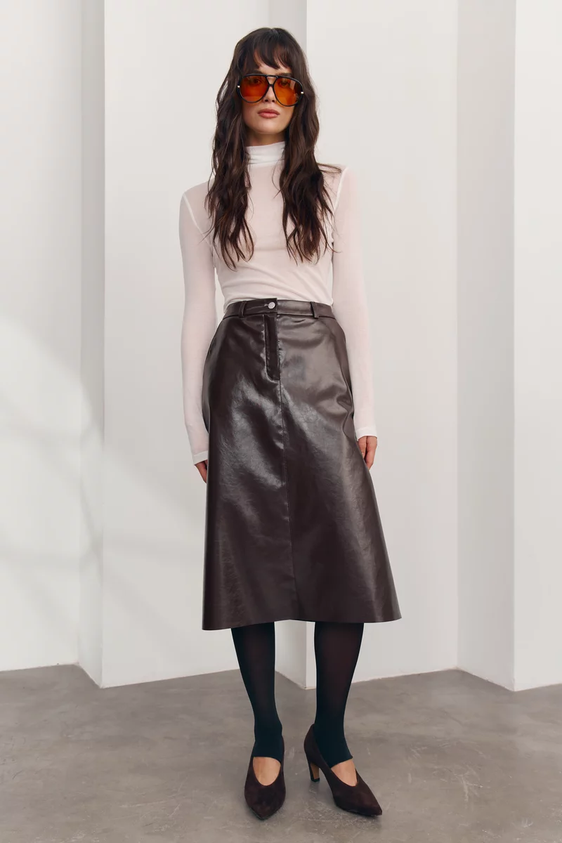 Не менш актуальними цієї весни є й шкіряні спідниці. Бренди GEPUR та iam створили їх у трендових і водночас елегантних відтінках — шоколадному та винному.