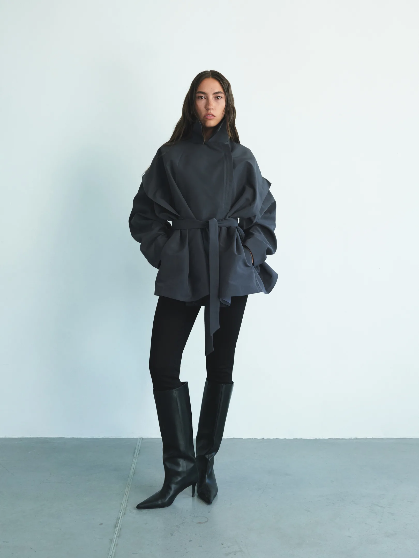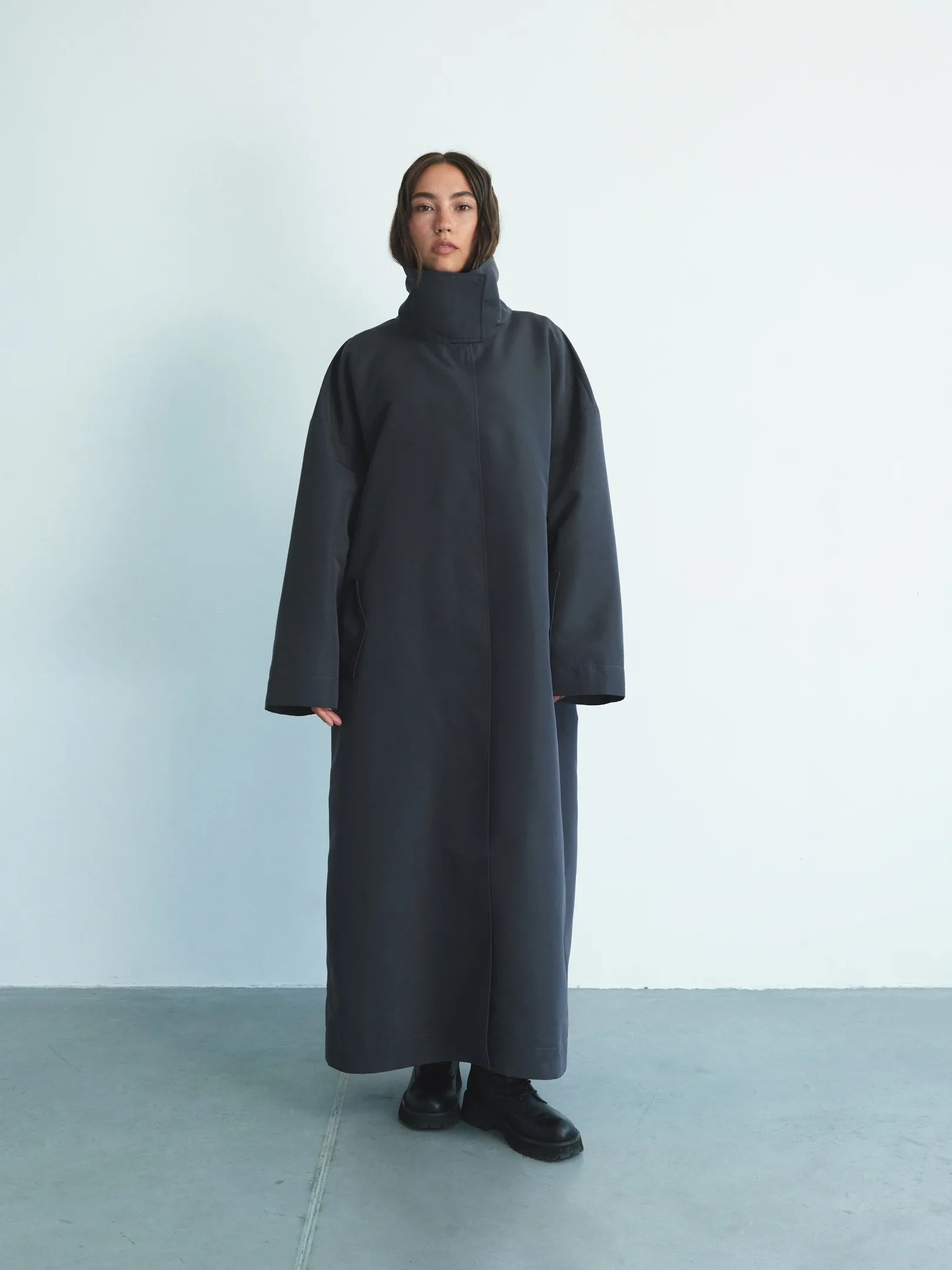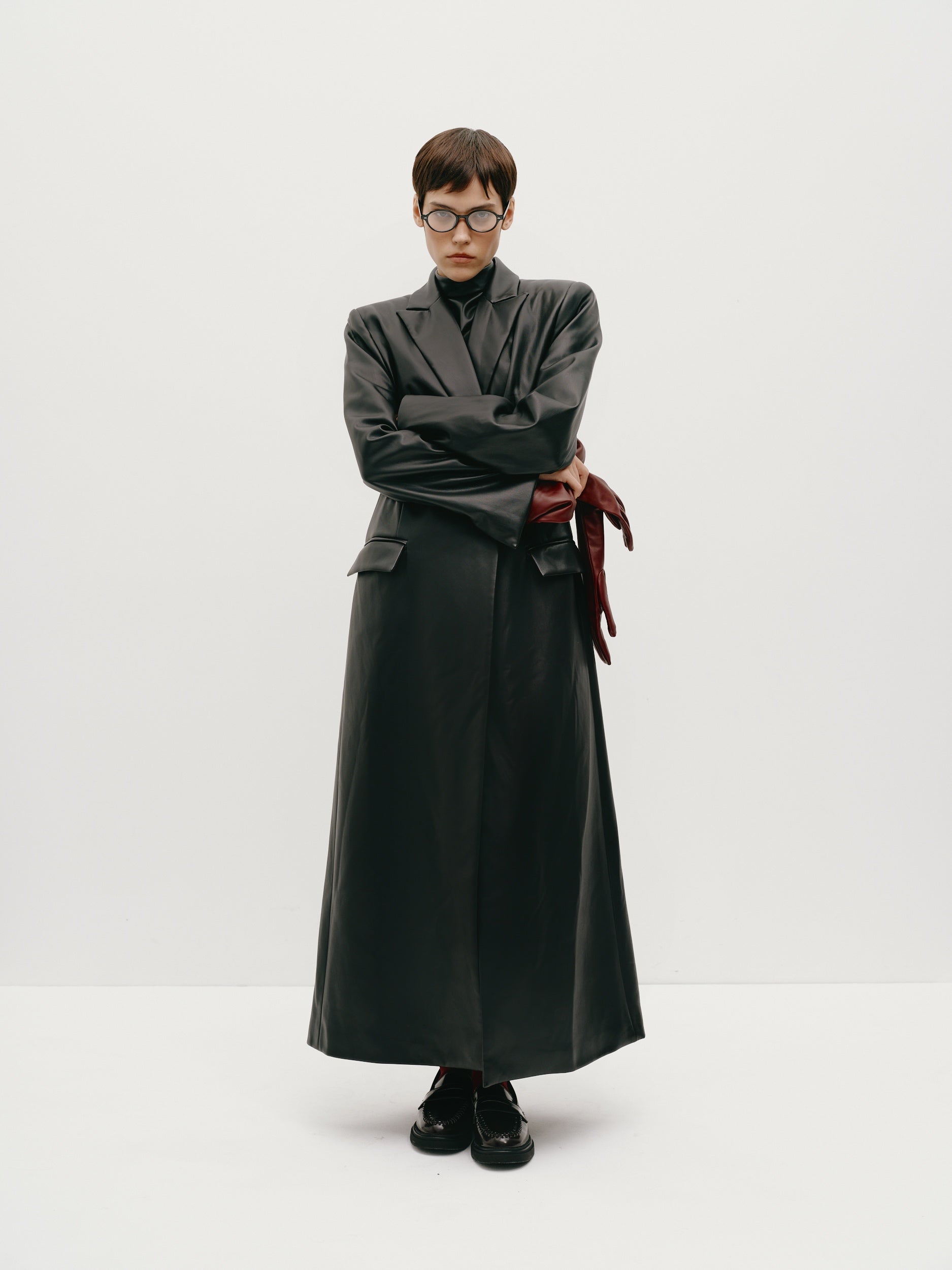 Не менш актуальні й моделі з виразним коміром-стійкою — таку представив бренд Mocko. Також у тренді тренчі з розслабленим силуетом — прямі, без поясу, або з інтегрованим палантином чи шарфом, як у VEM VET atelier.