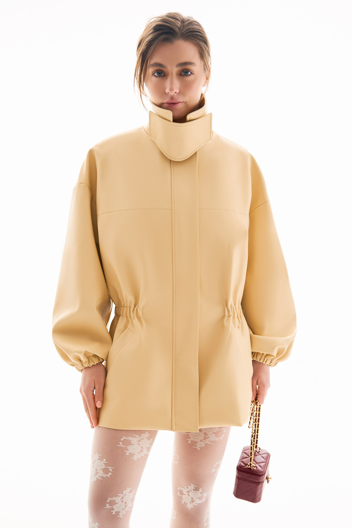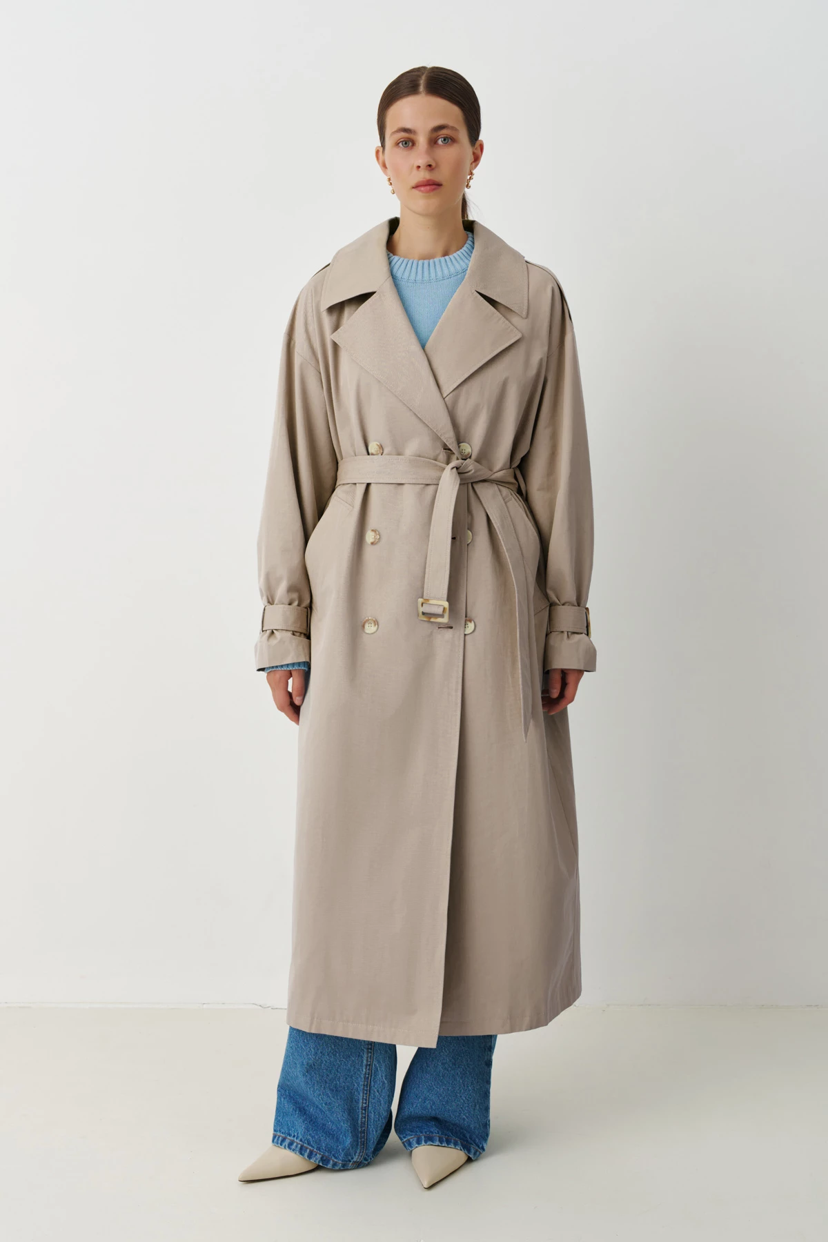 Довгий бежевий тренч з акцентом на талії — класика міжсезоння. Мода полюбила цей верхній одяг за його стилістичну універсальність і практичність. Він елегантно доповнює щоденні образи та є легким і негроміздким, а також допомагає зберігати комфорт у вітряну погоду чи під час легкого дощу.