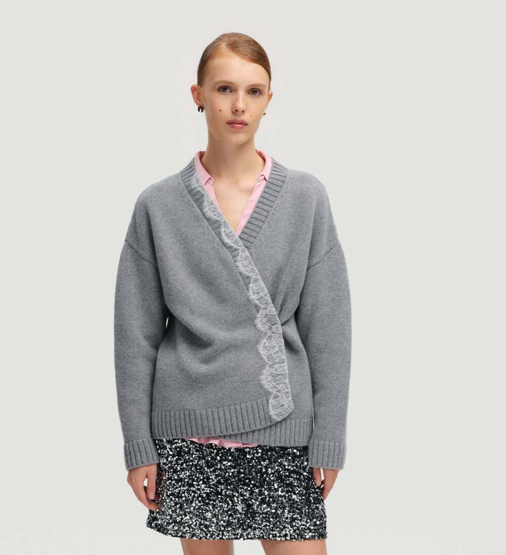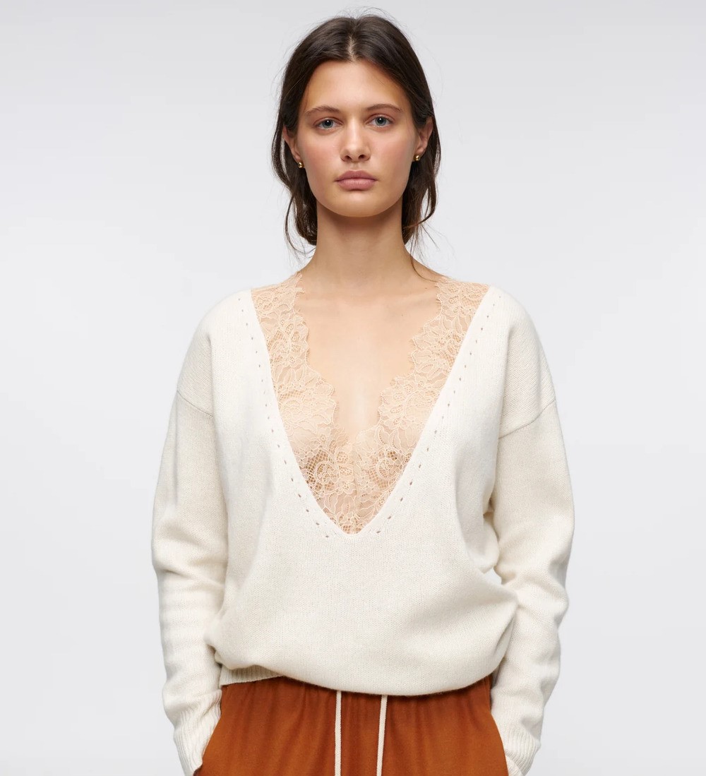 В асортименті українських марок представлені чимало верхів, декорованих мереживом: тендітні сатинові топи, спокусливі боді, а також тепліші варіанти, як-от кардиган GUNIA Project із вовни та кашеміру чи светр iam із глибоким декольте, обрамленим цим витонченим плетивом.