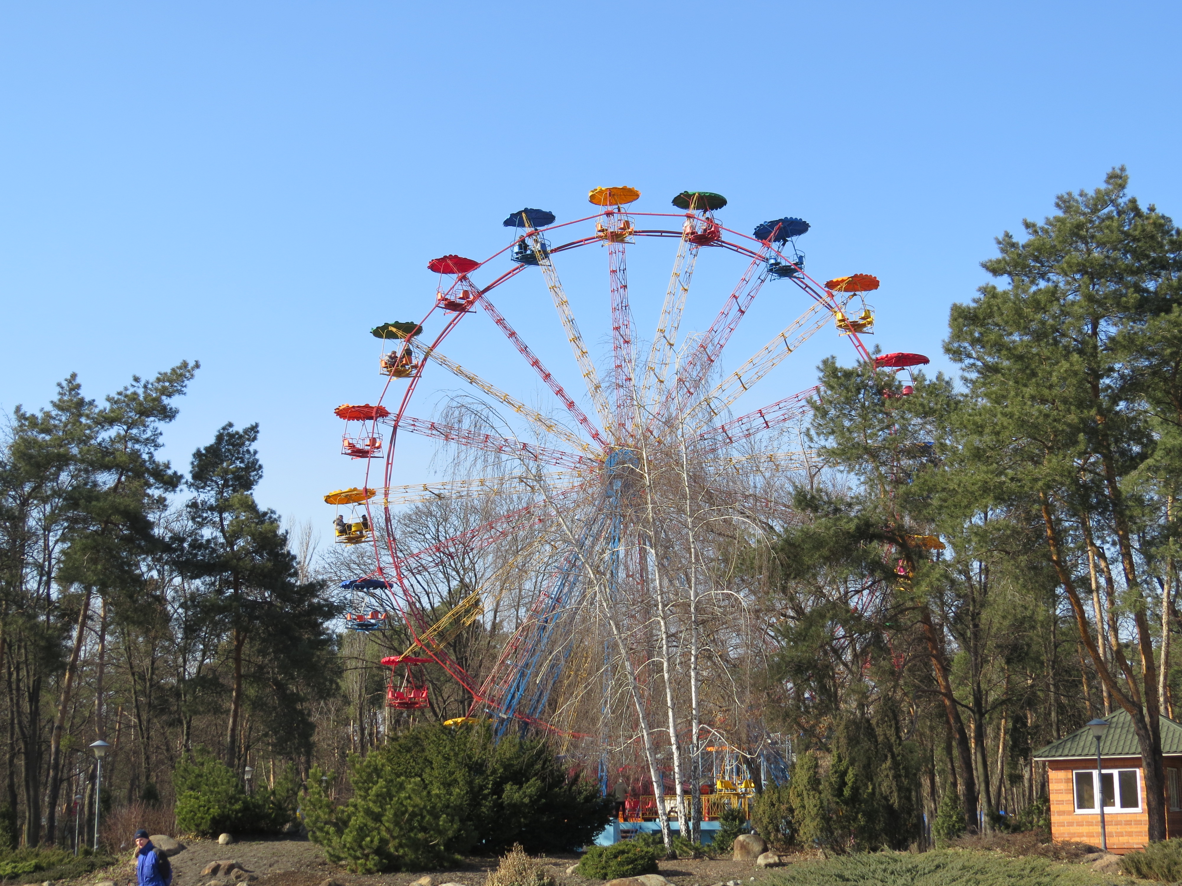Колесо огляду в Голосіївському парку завзято працює на розважальному фронті з 1986 року (от би підрахувати, скільки народу воно за цей час перевезло!). Атракціон має 20 кабінок, але зазвичай із метою безпеки їх навантажують людьми через одну. З усіх місцевих розважальних атракцій саме на колесо — найбільші черги. Та це і не дивно — Голосіївські пейзажі з нього просто фантастичні! Тож відчути вітер у волоссі охочих вистачає.