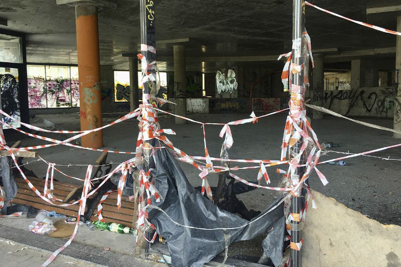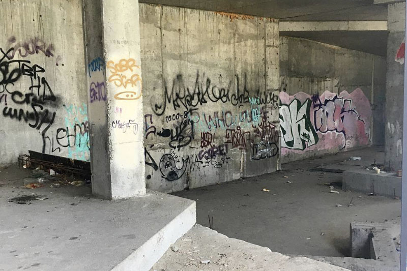 Нині тут голі стіни, розписані графіті, подекуди без вікон, з аварійними дірками всередині. Ці отвори мали прийняти ескалатори, якими можна було б дістатися з підземного рівня на гору. Огорож навколо цих дір немає. Тут постійно гуляють підлітки, їздять велосипедисти та скейтери.