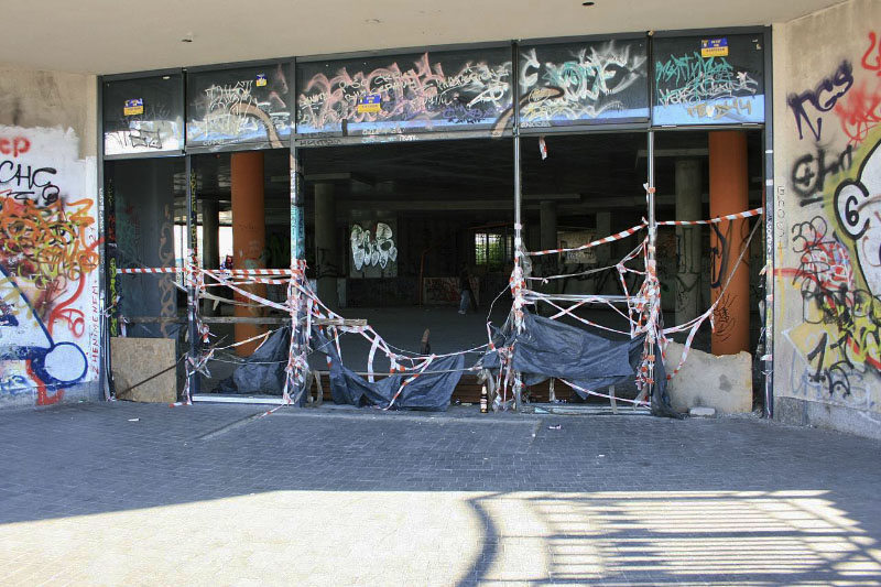 Входи до занедбаного ТРЦ обнесені стрічкою — але кого це зупиняло? Судячи із запаху — явно не охочих справити природну потребу.