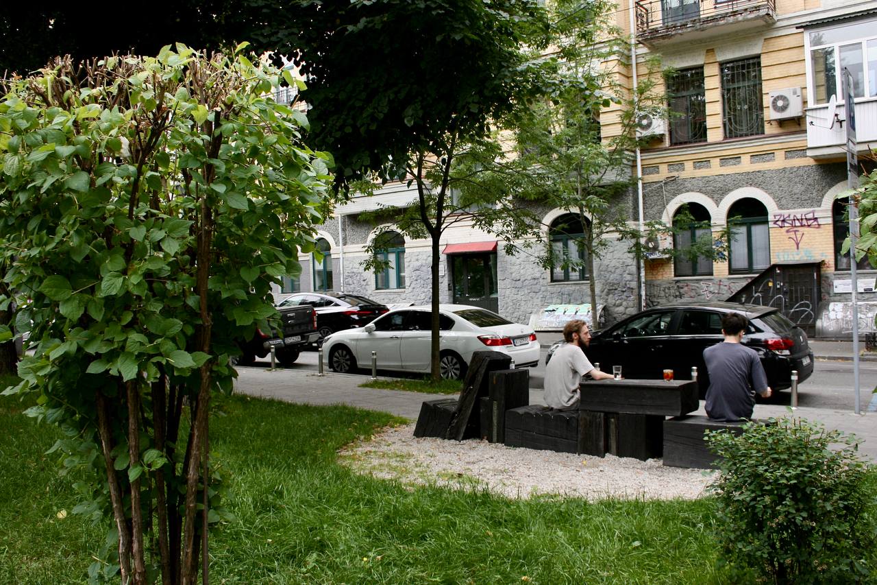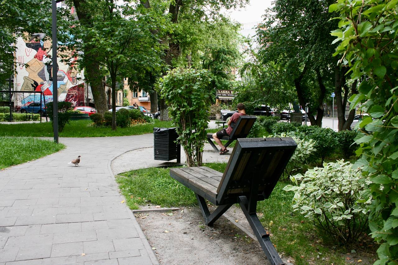 У скверику незвично багато лавочок, що для Києва, відверто кажучи, рідкість. Локацію можна також назвати "сквером інтровертів": тут багато місць для читання наодинці. Це можна робити навіть лежачи — деякі лавочки схожі на лежаки з піднятими спинками.
