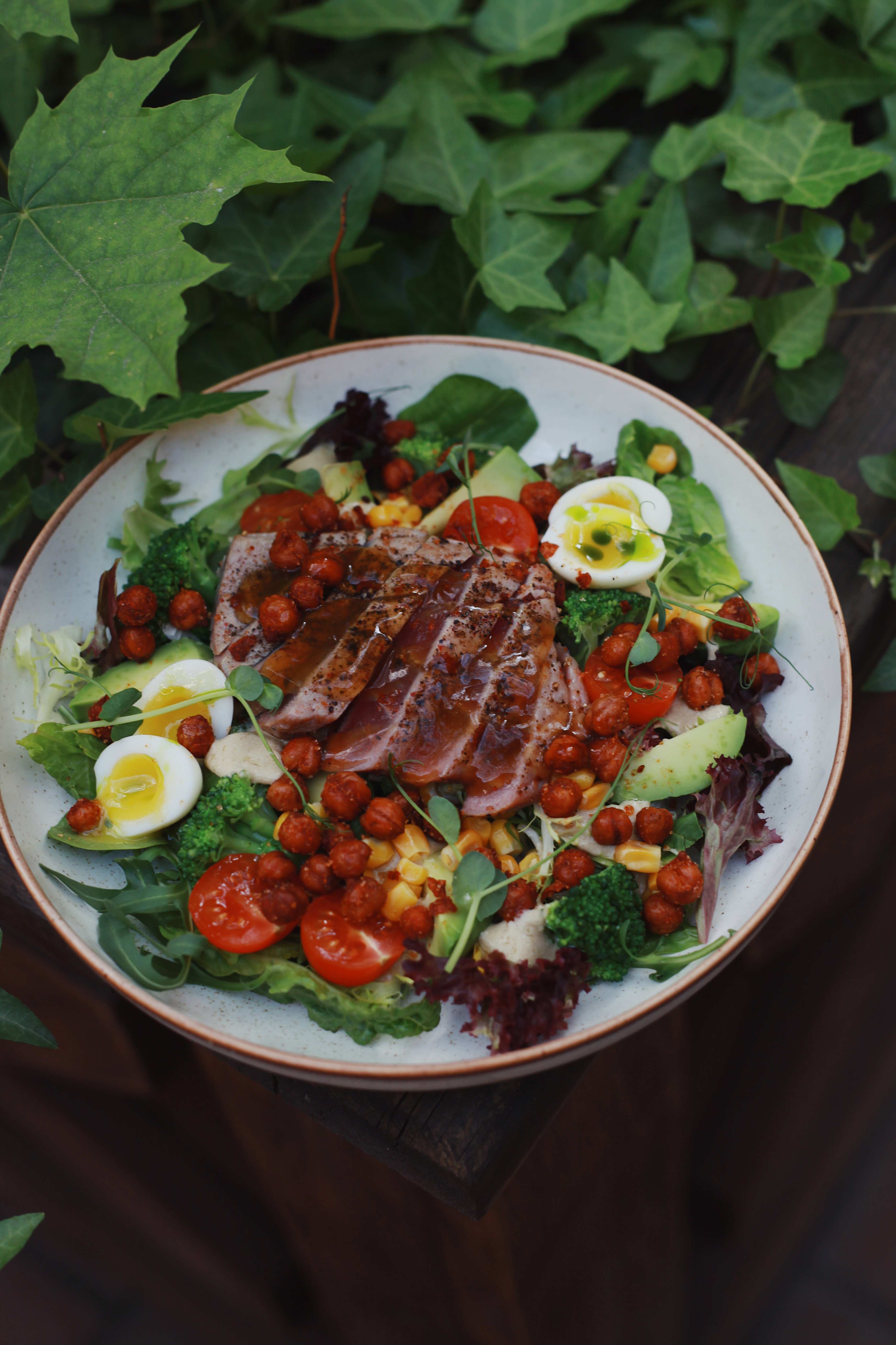 - Салат з тунцем, авокадо та хрустким попкорном з нуту.