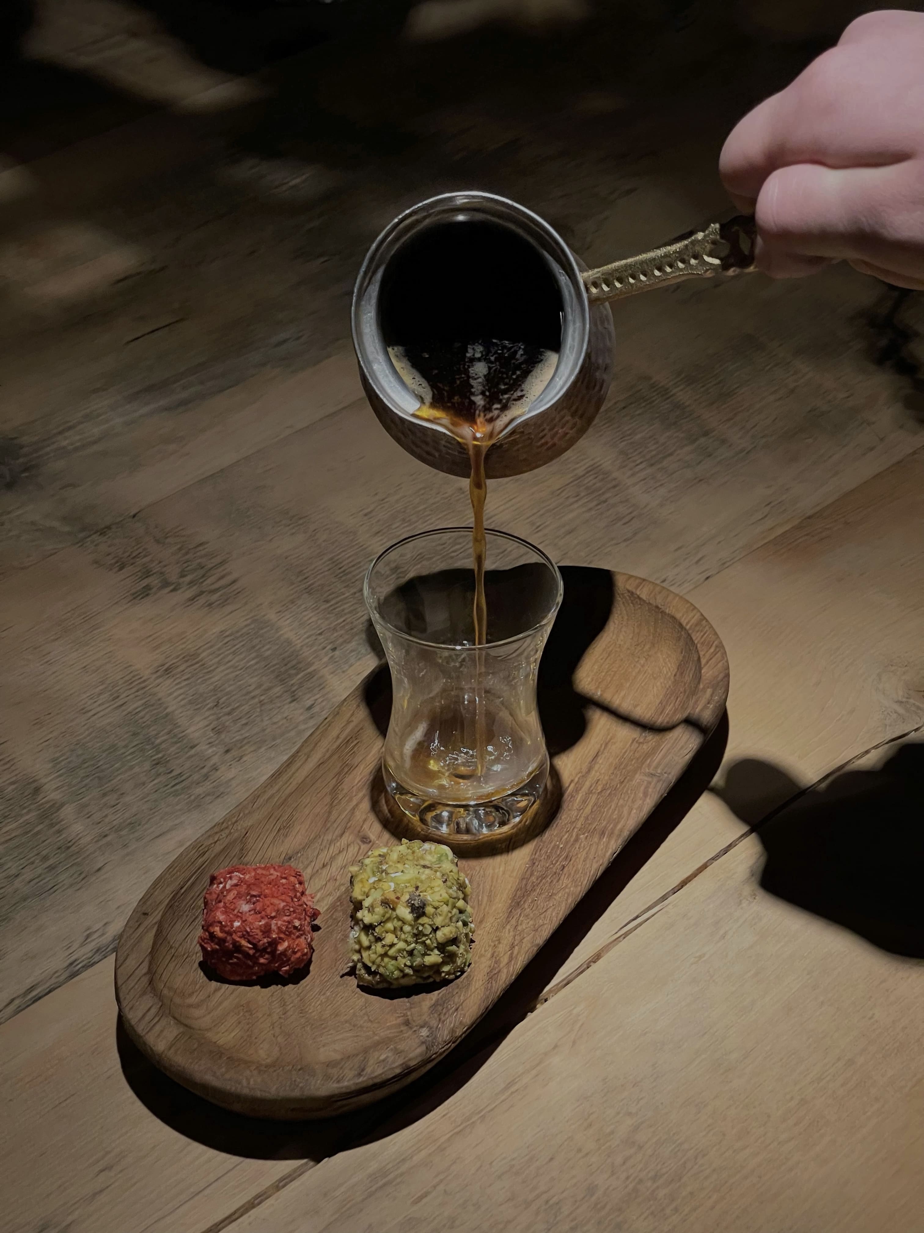 - СКІЛЬКИ? Каре кава (чорна кава) — 45 грн; сютлю (на молоці) — 60 грн; тарчин з какао та корицею — 45 грн; джигіт (на зеленому чаї) — 55 грн.