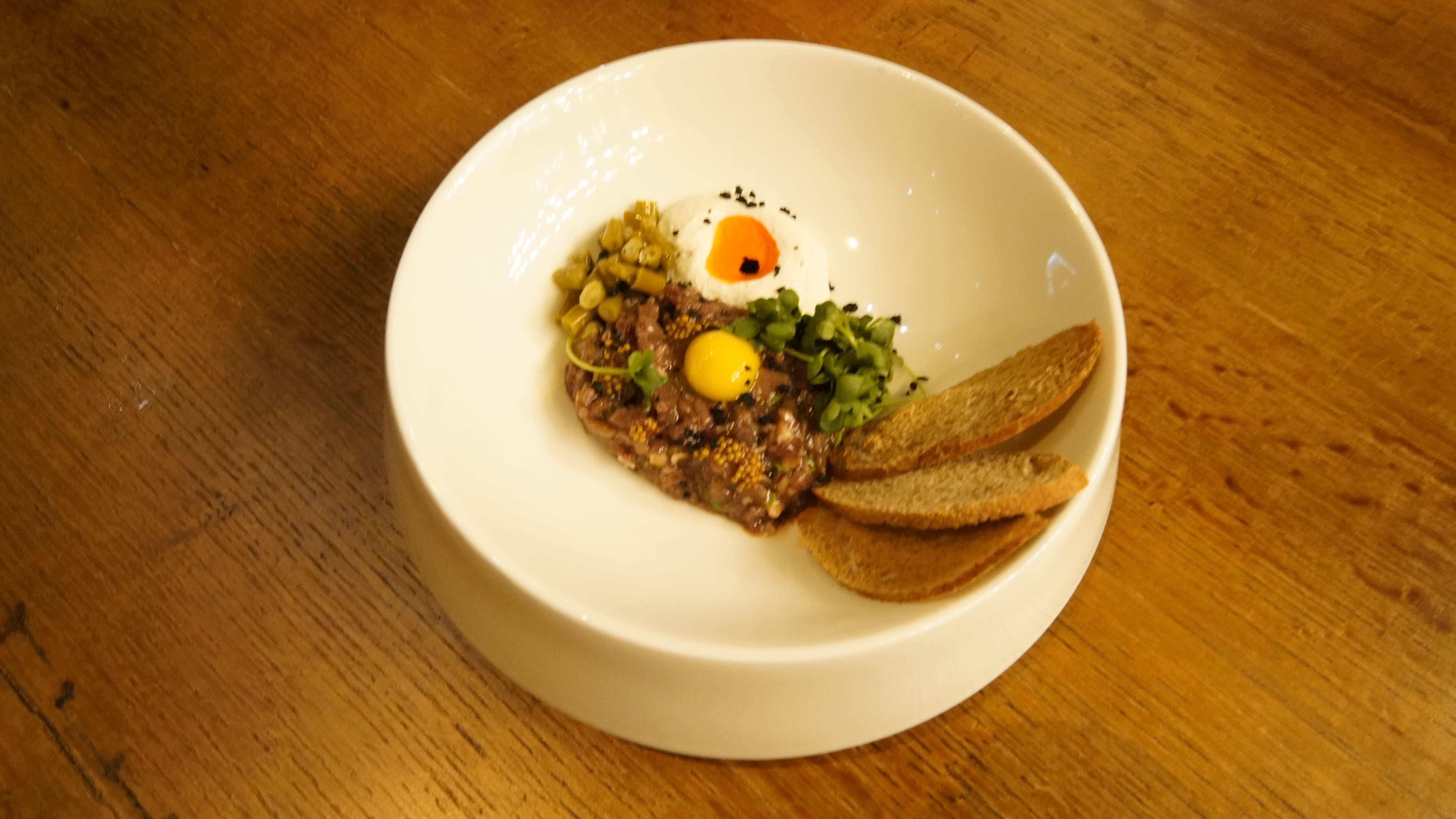Фото: "ТиКиїв" Шеф-кухар ресторану особливо рекомендує тартар з телятиною. Намастіть ніжний мус з білих грибів на хрустку грінку з хлібців, що випікають у Boho, додайте трохи тартару та стручкової квасолі. Страву декорують жовтком з перепелиних яєць, копченою олією паприки та мікрогріном. Для приготування холодної закуски шеф Денис Новохацький використовує локальні продукти: білі гриби із Закарпаття та фермерське м'ясо з Миргородського м'ясокомбінату.