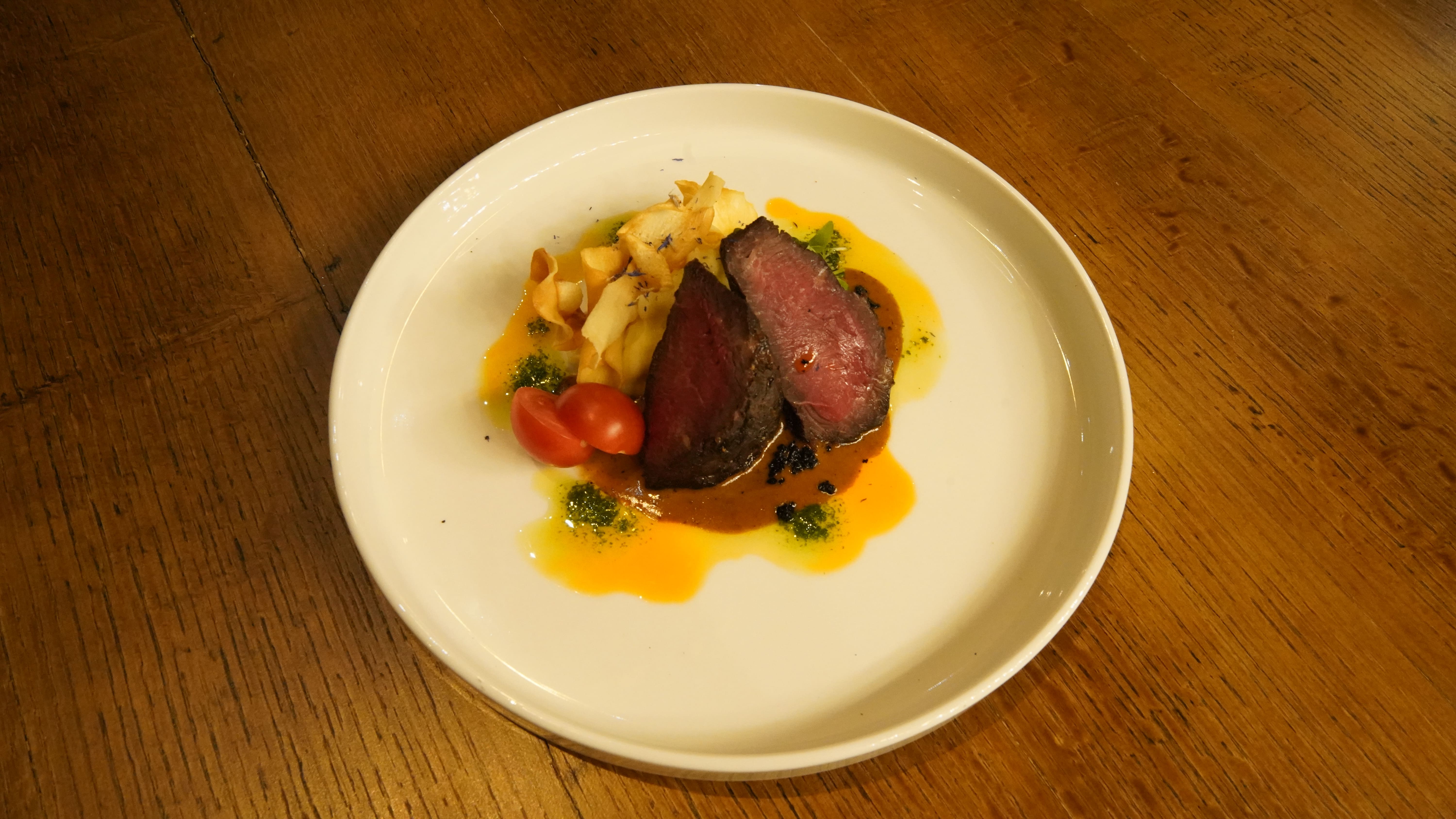 Фото: "ТиКиїв" Основна страва — соковитий великий шматок м'яса, яке готують за технологією sous-vide при низьких температурах без просмаження, щоб зберегти яскравий та ніжний смак стейка. Відмінний варіант для ситного обіду чи вечері. Страва подається з пюре та чипсами із пастернаку з помідорами чері та соусом Black Pepper, що додає їй пікантності.