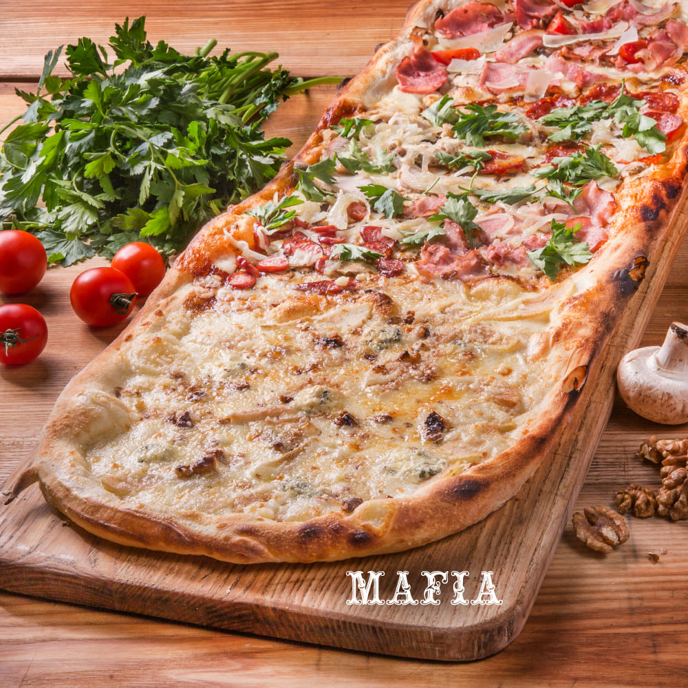 Легендарна метрова піца з різними начинками – це візитівка закладів MAFIA. Вже 16 років гості замовляють її в ресторанах Києва, Дніпра, Миколаєва та Харкова.