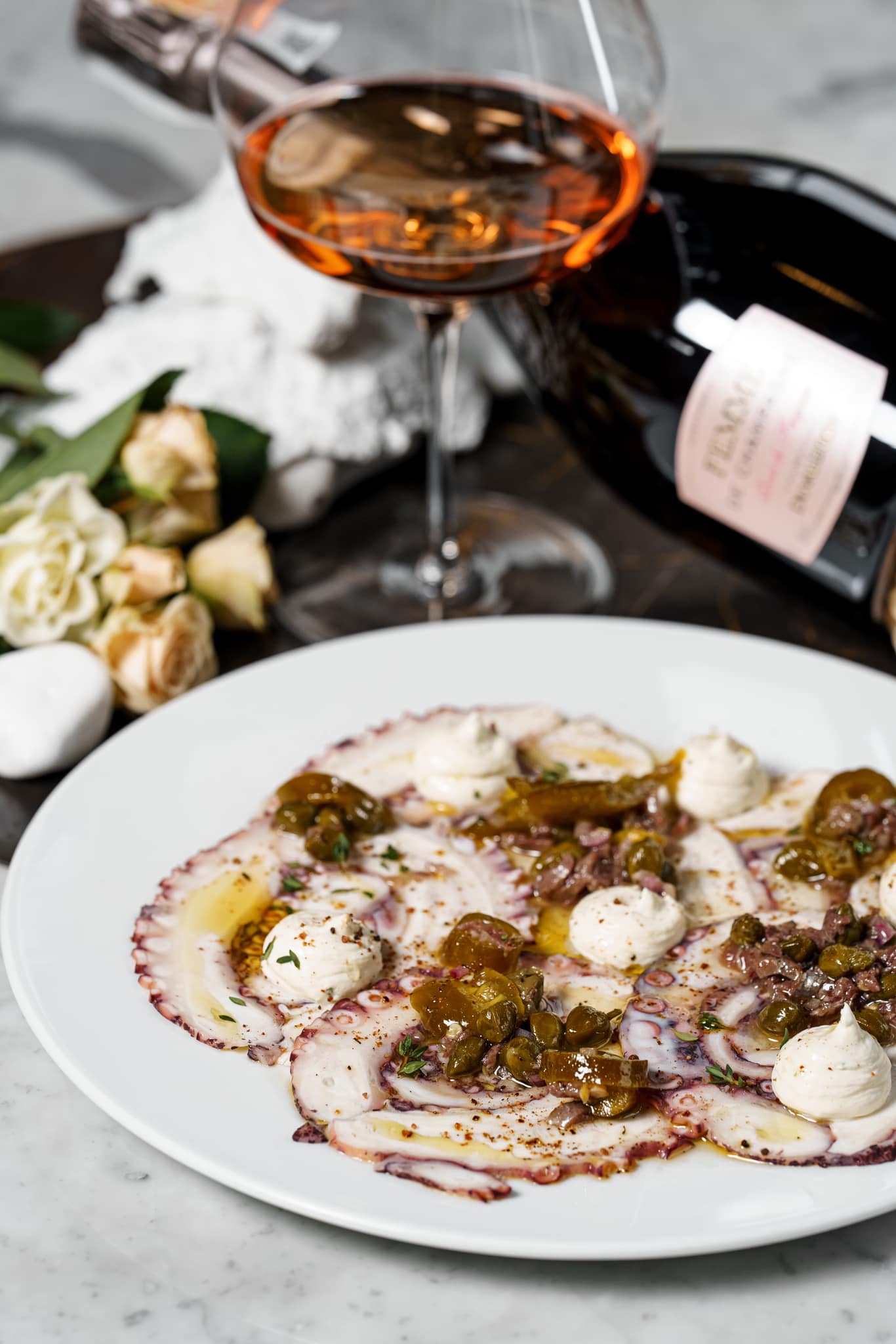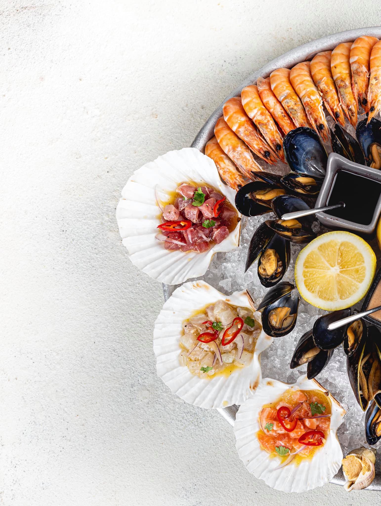 - Мале плато морепродуктів – креветки, булоти, фаланги королівського краба, клішні краба турто, сашимі з лосося, тунця та вугра, креветки гамба роха, паста з тунця, три устриці фін де клер № 2, три устриці жилардо № 2) – 3 950 грн.