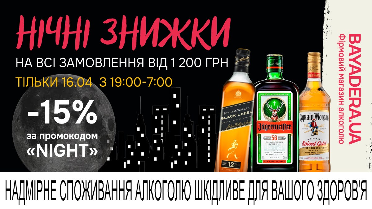16-17 квітня з 19:00 до 7:00 діє спеціальна знижка -15% на замовлення від 1200 грн. Обирай напої з акційного асортименту, вводь промокод NIGHT у кошику й отримуй знижку. Доставка — у зручний для тебе спосіб.