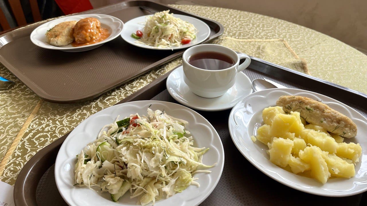 Чай тут коштує лише 8,80 грн! Пюрешка обійдеться в 18,30 грн, а рибна котлетка — 46,70 грн. Смачно, мені все зайшло. Окрема шана ввічливим працівникам — особливо охоронцям і кухарям.