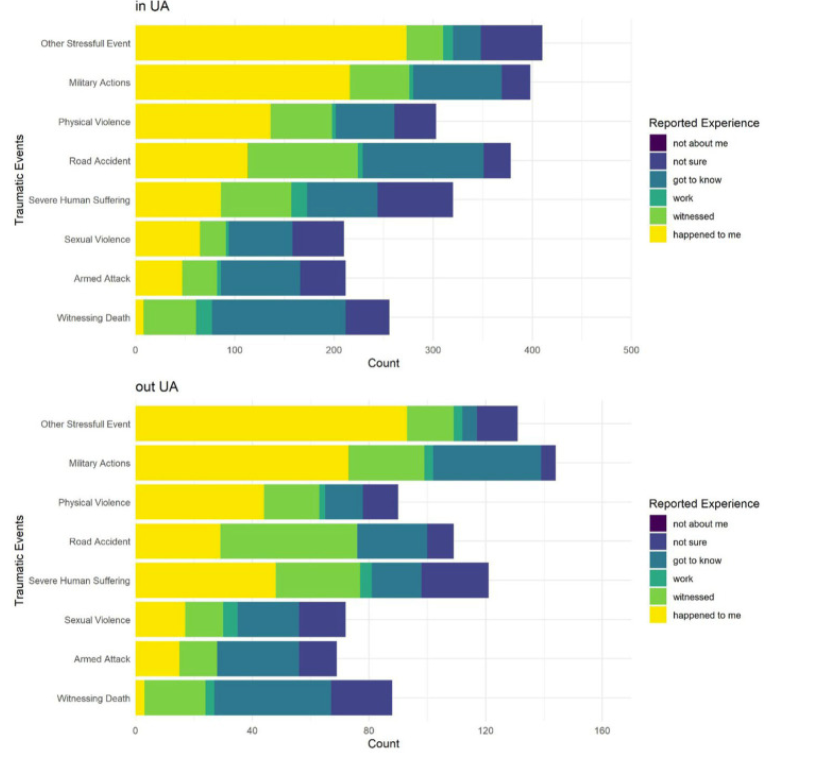 *Вплив травматичного досвіду вимірювався за шкалою Life Event Checklist DSM-5. Найбільш поширені травматичні переживання, які відбулися з українцями: стали свідками смерті — 1,6%, пережили збройний напад — 8,8%, пережили сексуальне насильство — 11,6%, були свідками тяжких людських страждань — 19%, пережили ДТП — 20,3%, зазнали фізичного насильства — 25,6%, пережили воєнні дії — 41,1%.