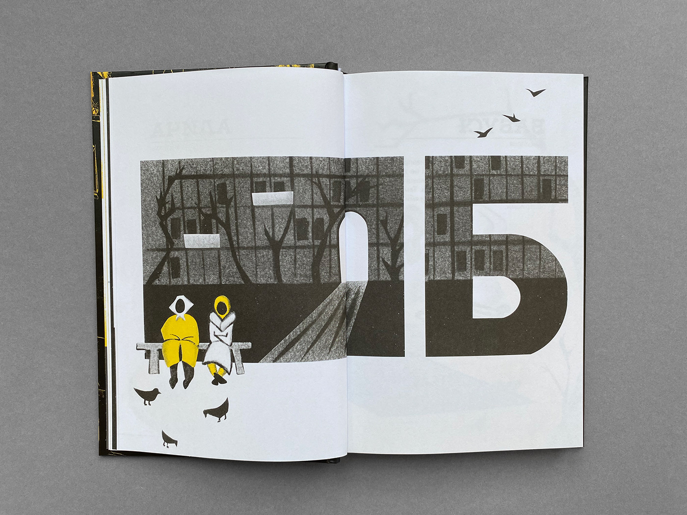 Для створення картинок я поєднувала ручні техніки (тиснення, трафарет, монотипію, аплікацію) та діджитал-техніки (Procreate, Photoshop). Найбільше кайфувала від створення штампів із картоплі, моркви, капусти та інших овочів. Я вирізала з них фігурки (будинки, дерева, людей), вмочувала у фарбу і залишала відбитки на папері, потім — домальовувала їх на планшеті. Як я жартувала, із цього міг би вийти борщ, але натомість з'явилися 108 ілюстрацій.